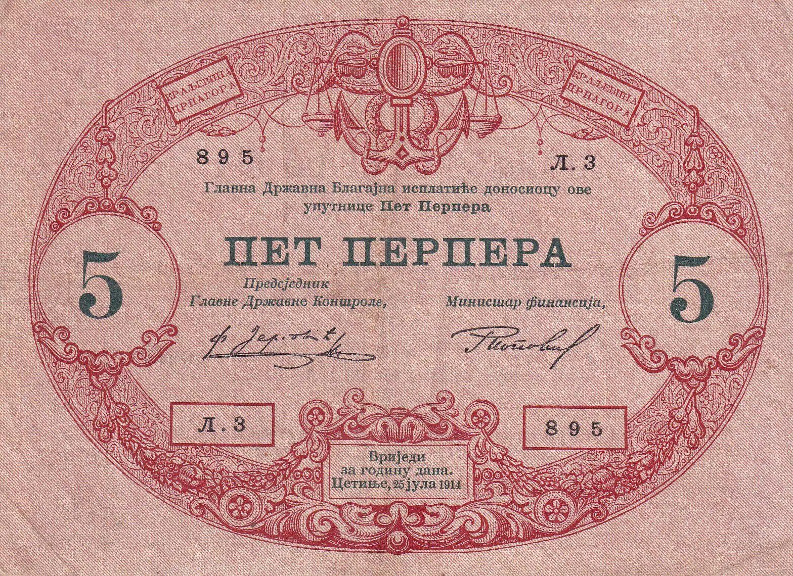 Banknote Montenegro 5 Perpera - Coat of arms - 1914 - Serial L.3 - P.17