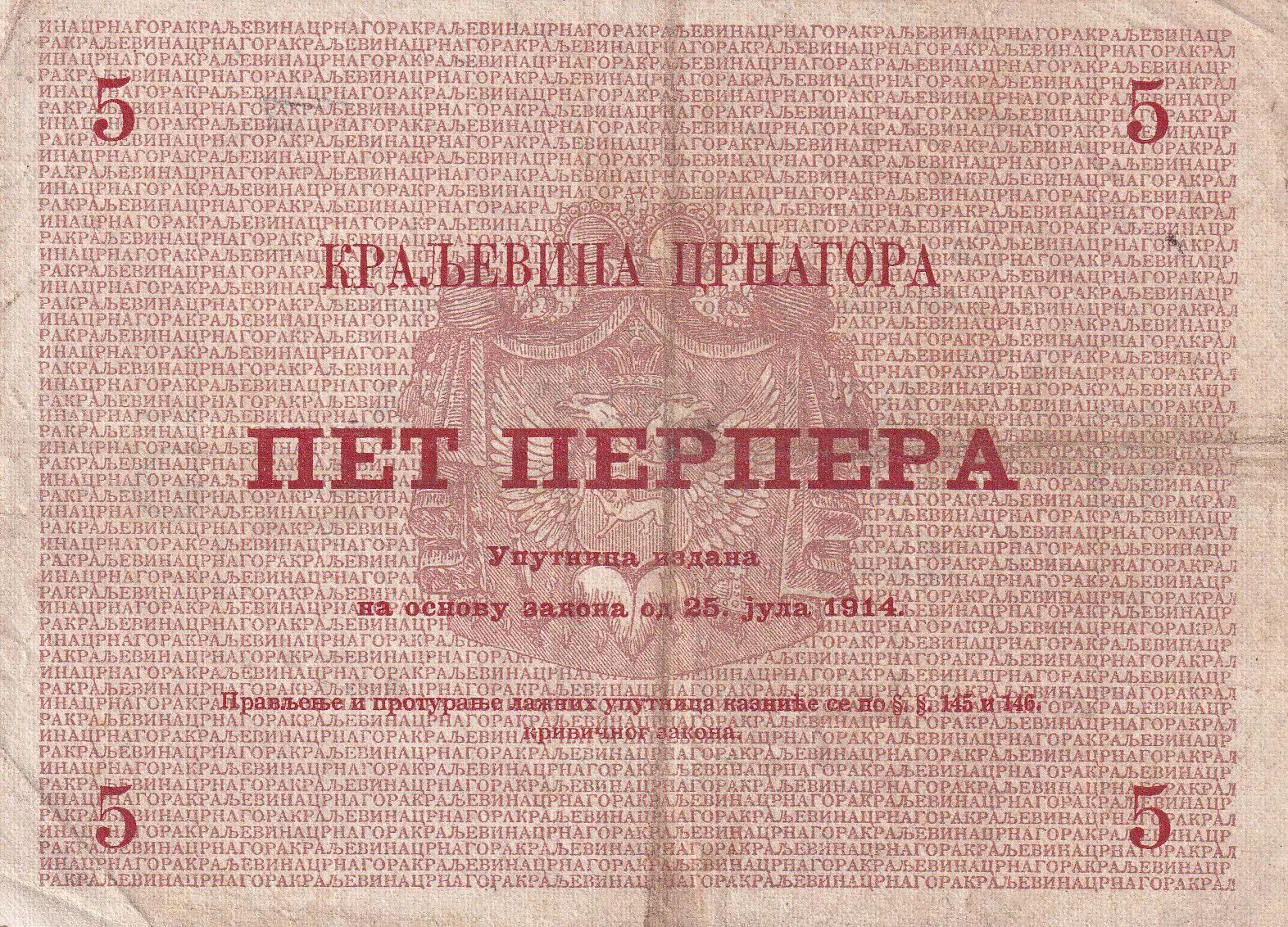 Home > > Montenegro 5 Perpera - Coat of arms - 1914 - Serial L.3 - P.17