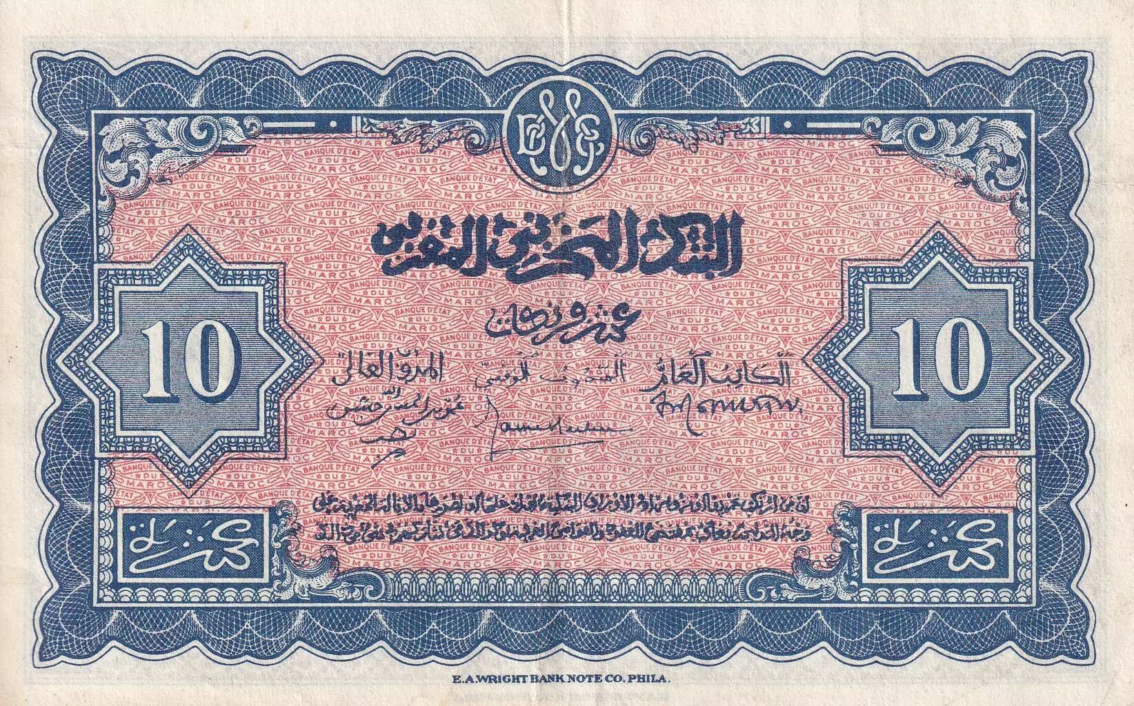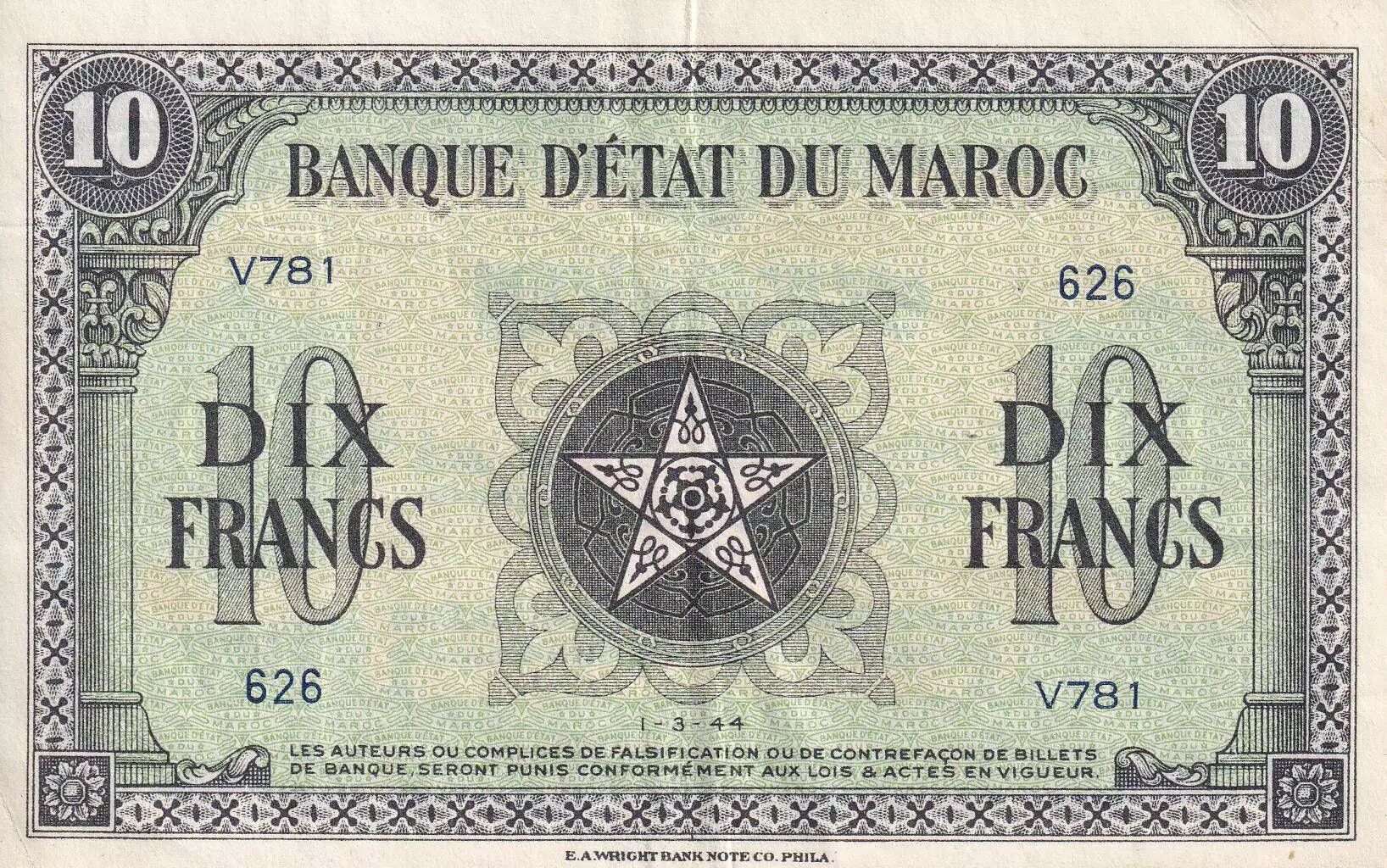 Home > > Morocco 10 Francs - 01-03-1944 - XF - Serial V.781 - P.25