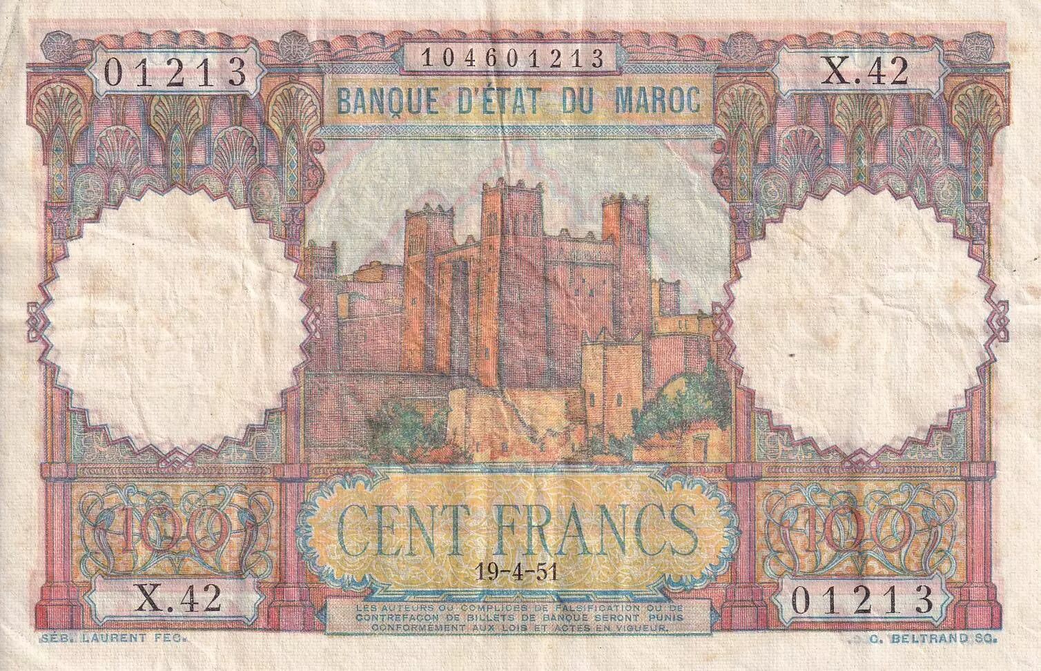 Banknote Morocco 100 Francs - Ksar d'Aït-ben-haddou - 19-04-1951 - VF - Serial X.42 - P.45