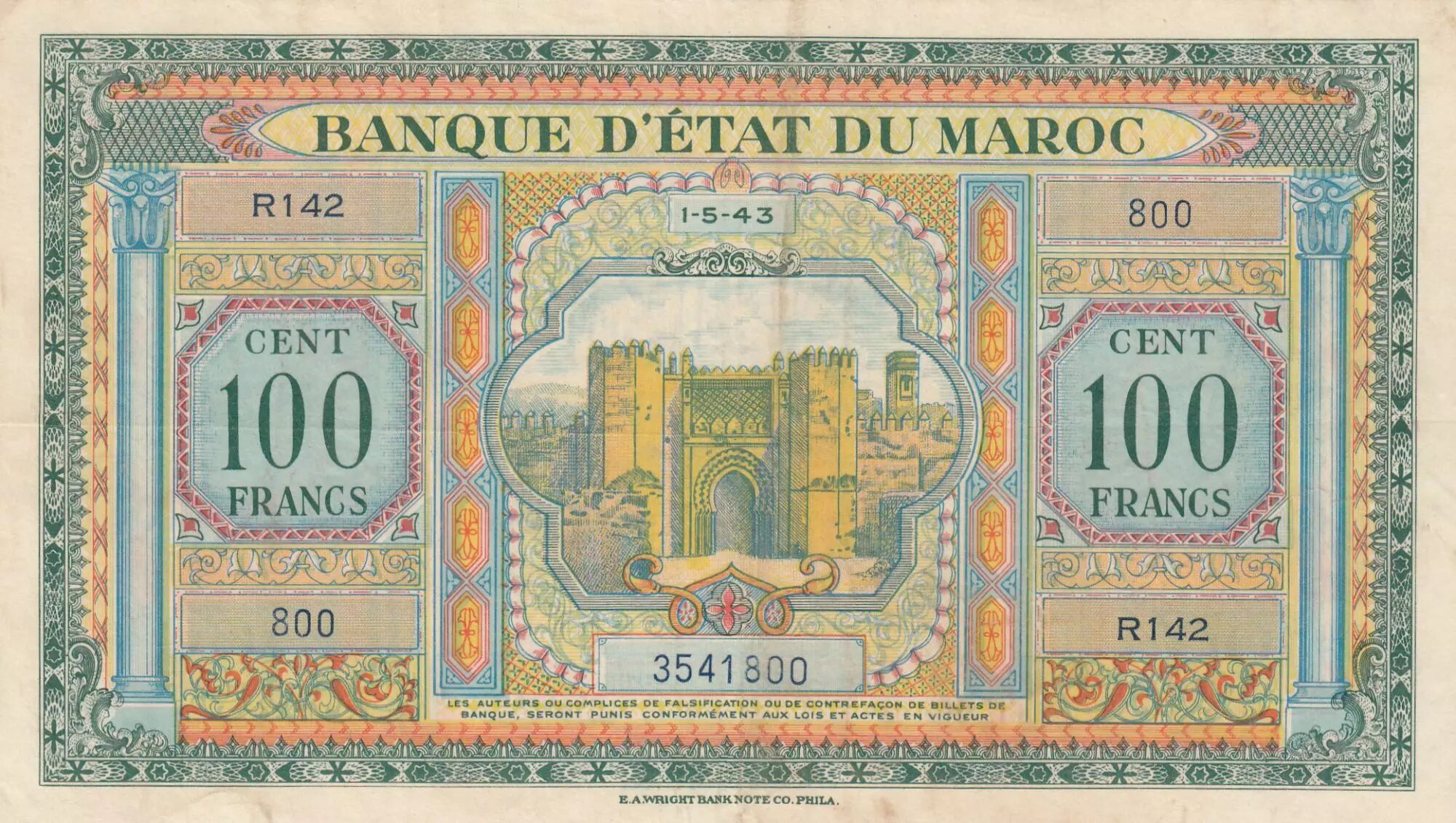 Home > > Morocco 100 Francs - Meknes - 1943 - VF to XF - Serial R.142 - P.27