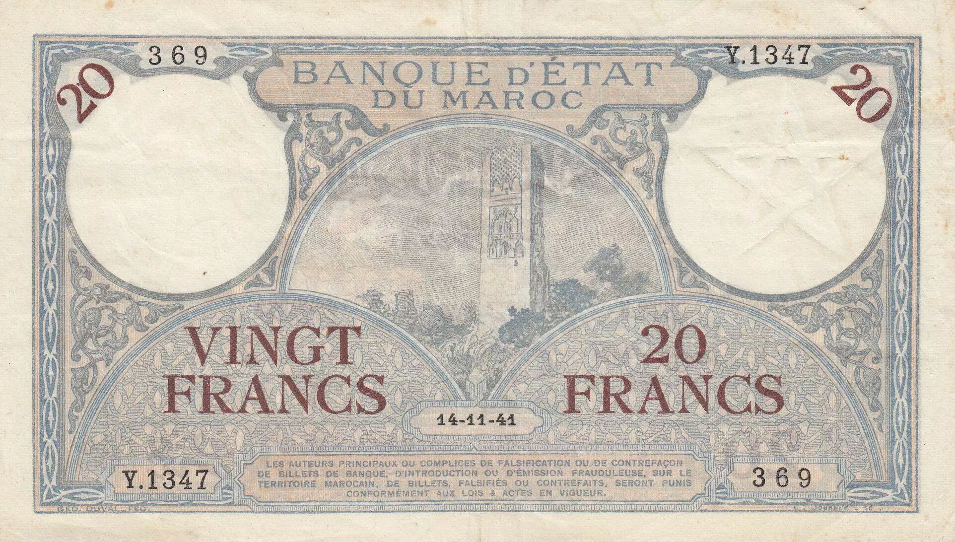 Home > > Morocco 20 Francs Minaret - 14-11-1941 - VF to XF - Serial Y.1347 - P.18b