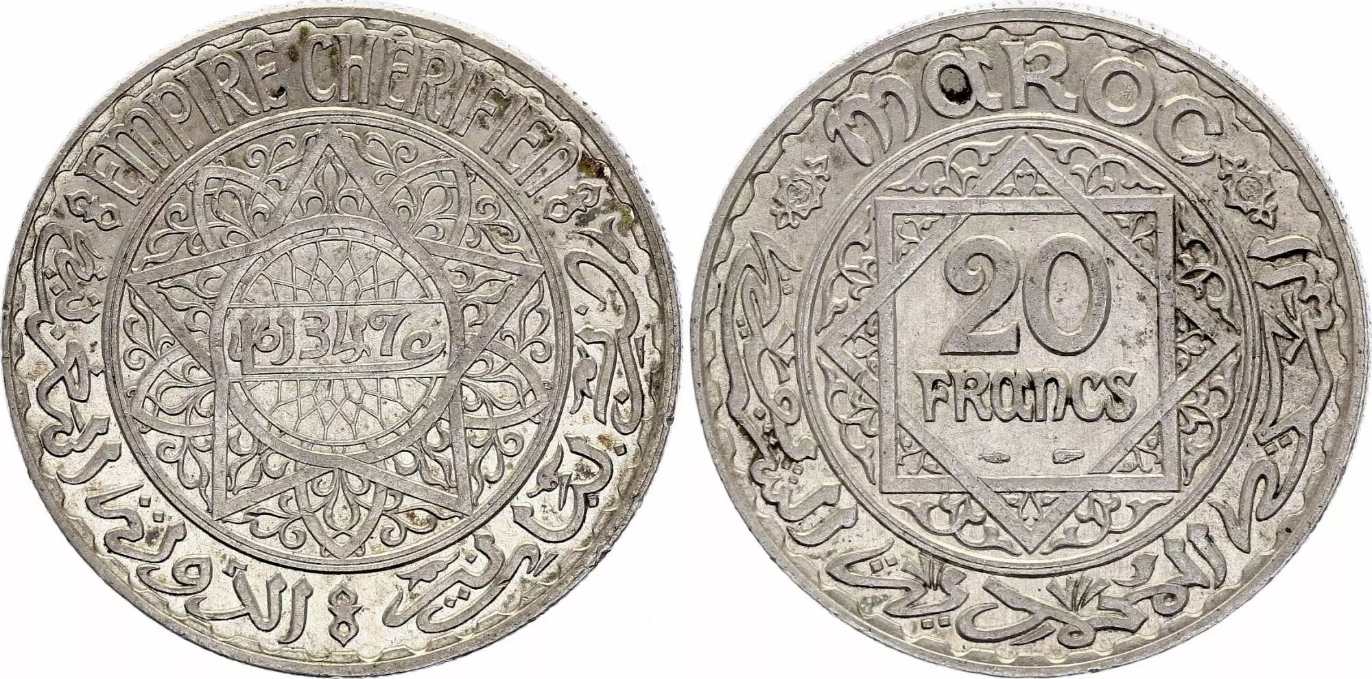 Coin Morocco 20 Francs, Mohammed V - 1347 (1928)