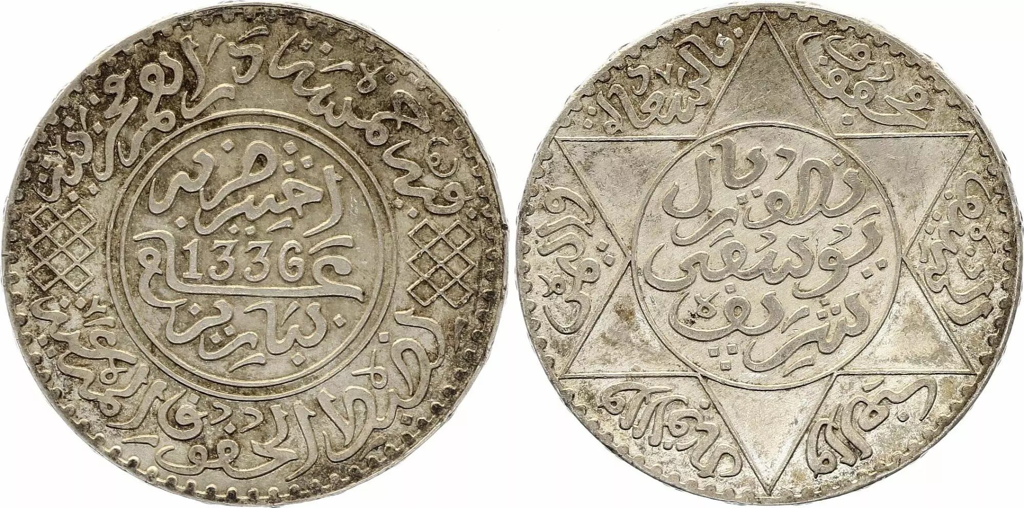 Home > > Morocco 5 Dirhams Youssef Ban Hassan - 1336 - Silver