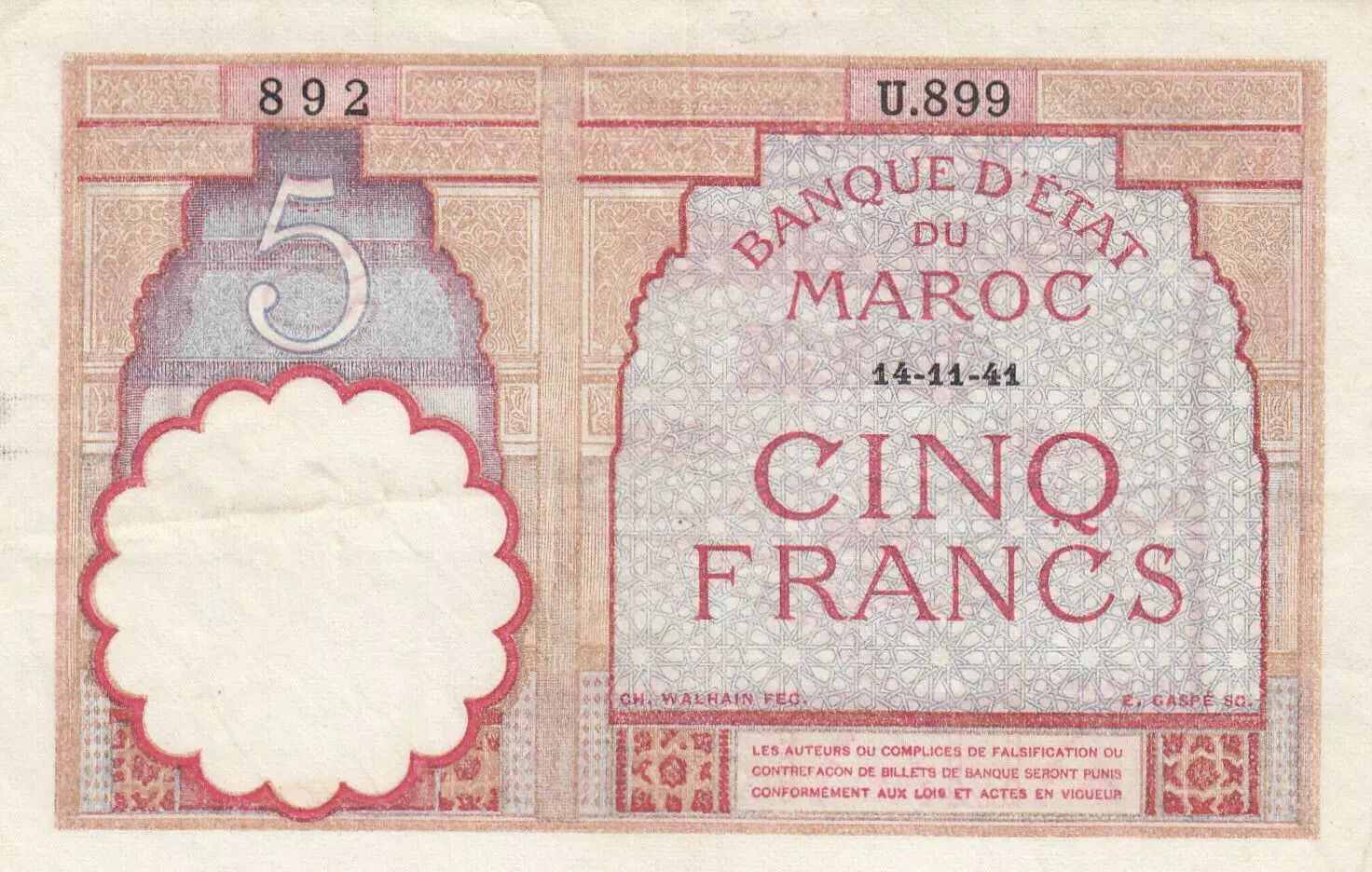 Home > > Morocco 5 Francs 14-11-1941 - VF - Serial U.899 - P.23Ab