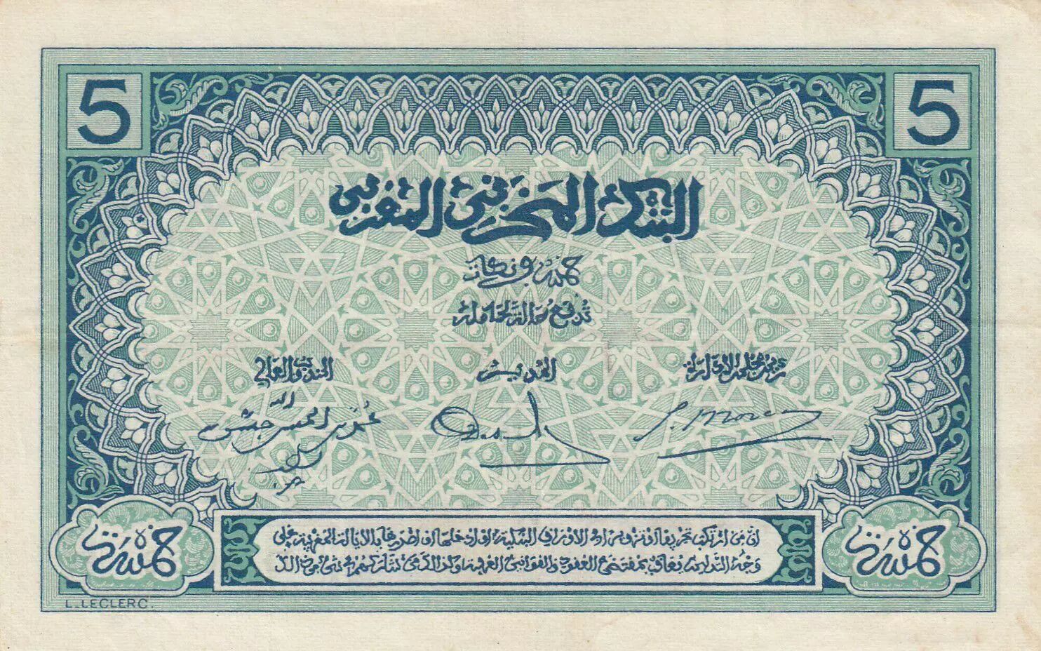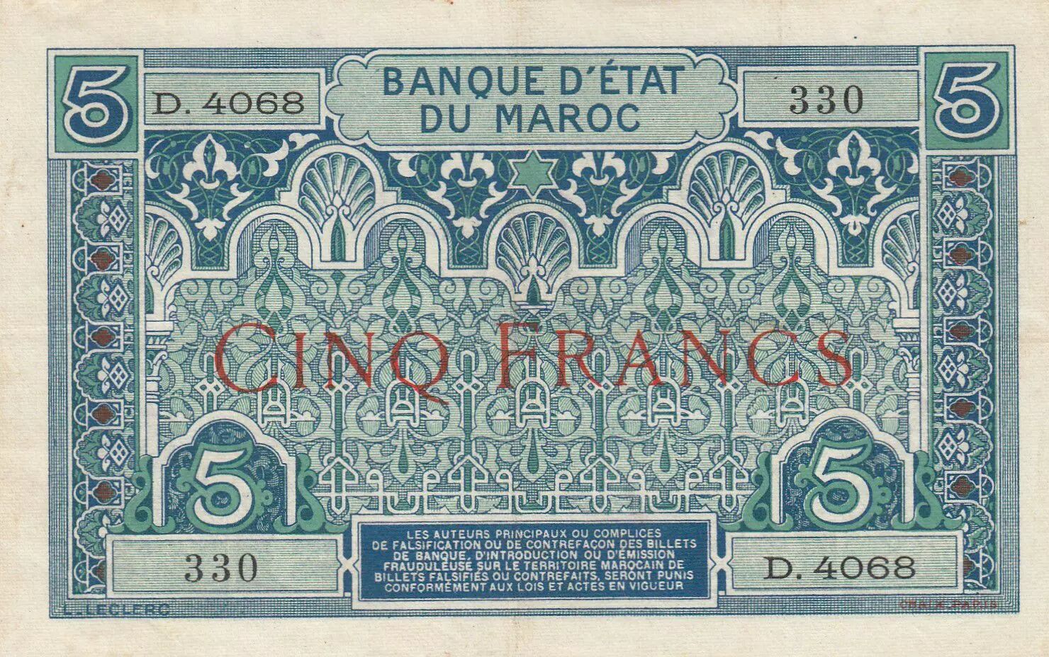 Home > World Banknotes > African Banknotes > Morocco > Morocco 5 Francs Blue and green - 1924 - Serial D.4068 - VF to XF - P.9