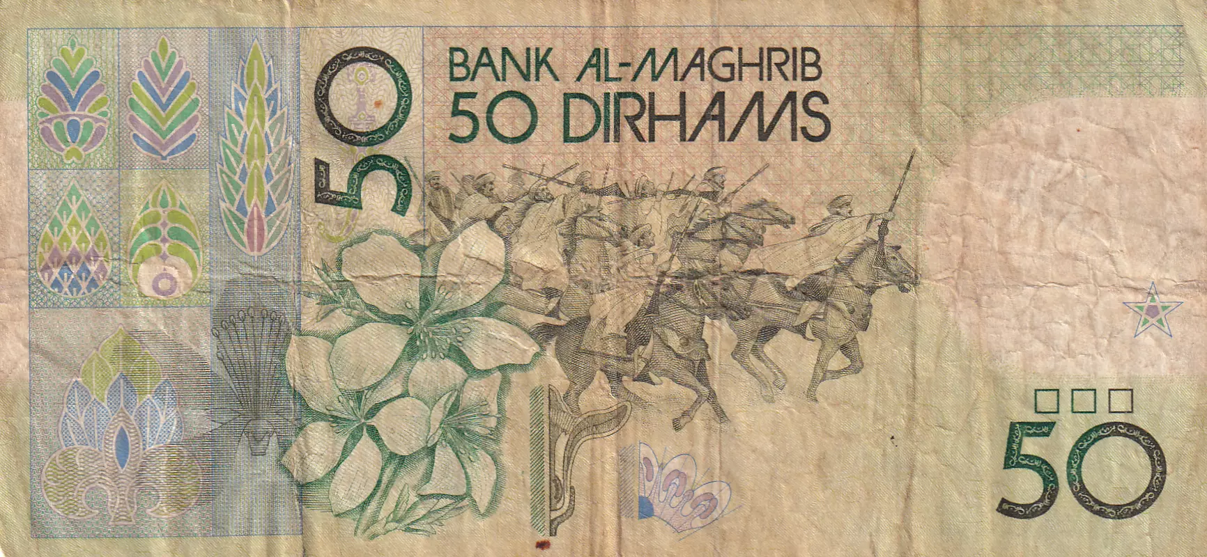Banknote Morocco 50 Dirhams - Hassan II - Mounted Milicia charging - 1987 - P.64b