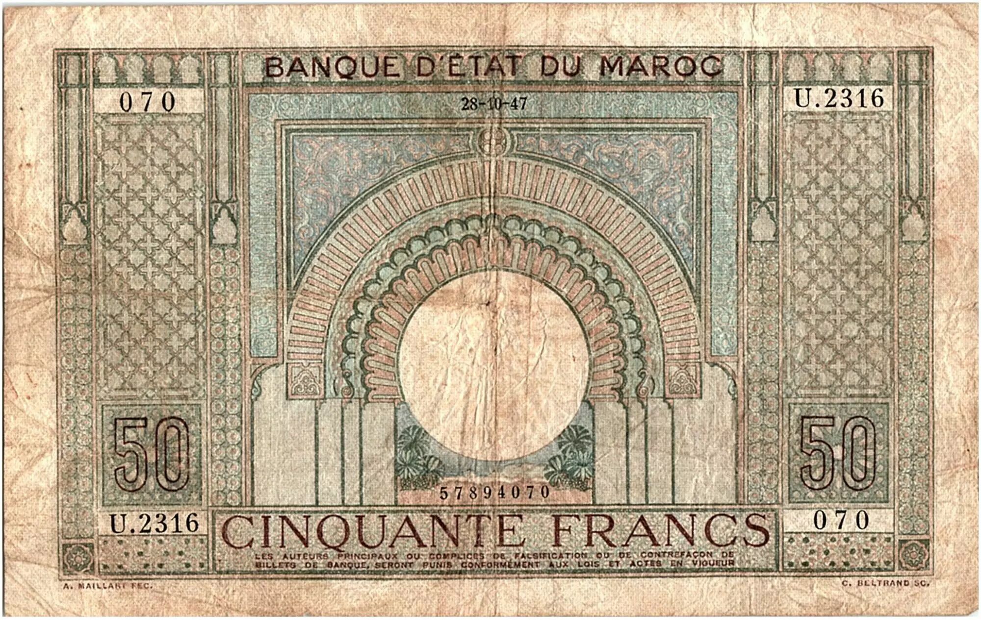 Home > World Banknotes > African Banknotes > Morocco > Morocco 50 Francs 28-10-1947 - Fine- Serial U.2316 - P.21