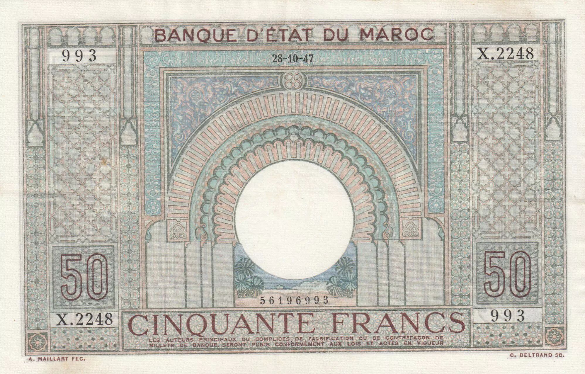 Banknote Morocco 50 Francs 28-10-1947 - XF - large type - Serial X.2248 - P.21