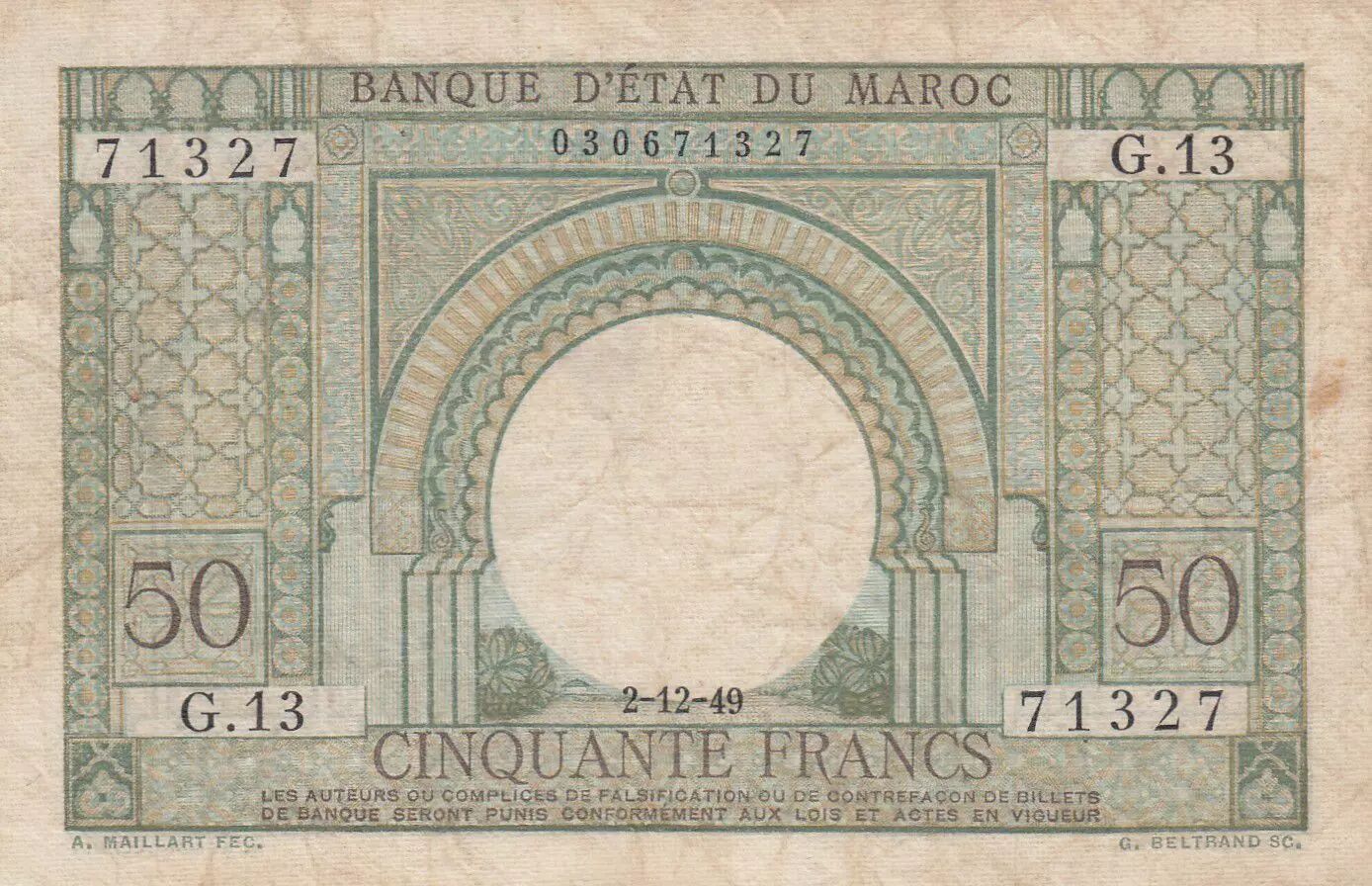 Home > World Banknotes > African Banknotes > Morocco > Morocco 50 Francs Gateway - 02-12-1949 - VF - Serial G.13 - P.44