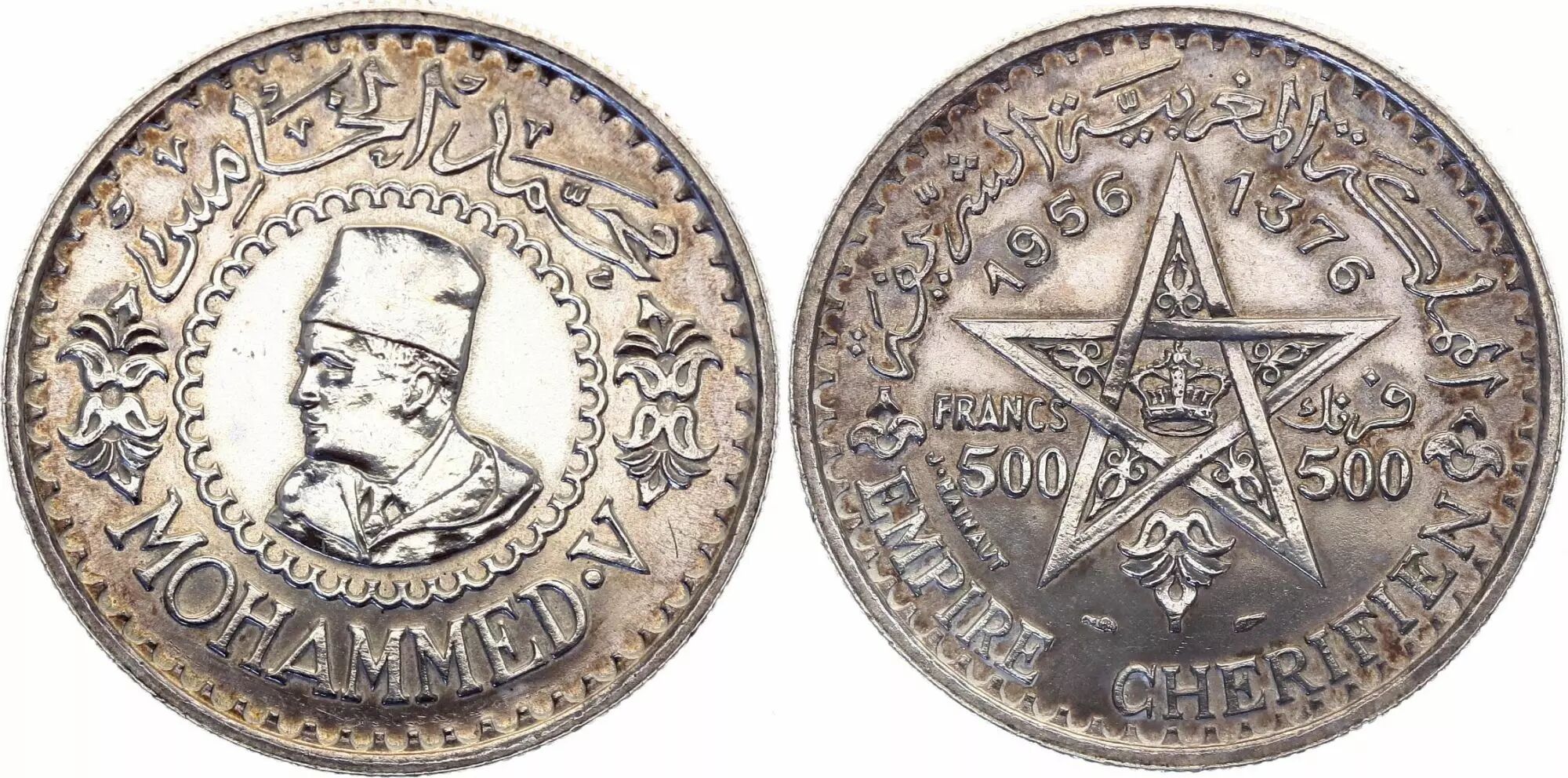 This coin is a 500 Francs piece, struck in silver, and issued by Morocco in 1956 (1376 of the Hijri calendar).