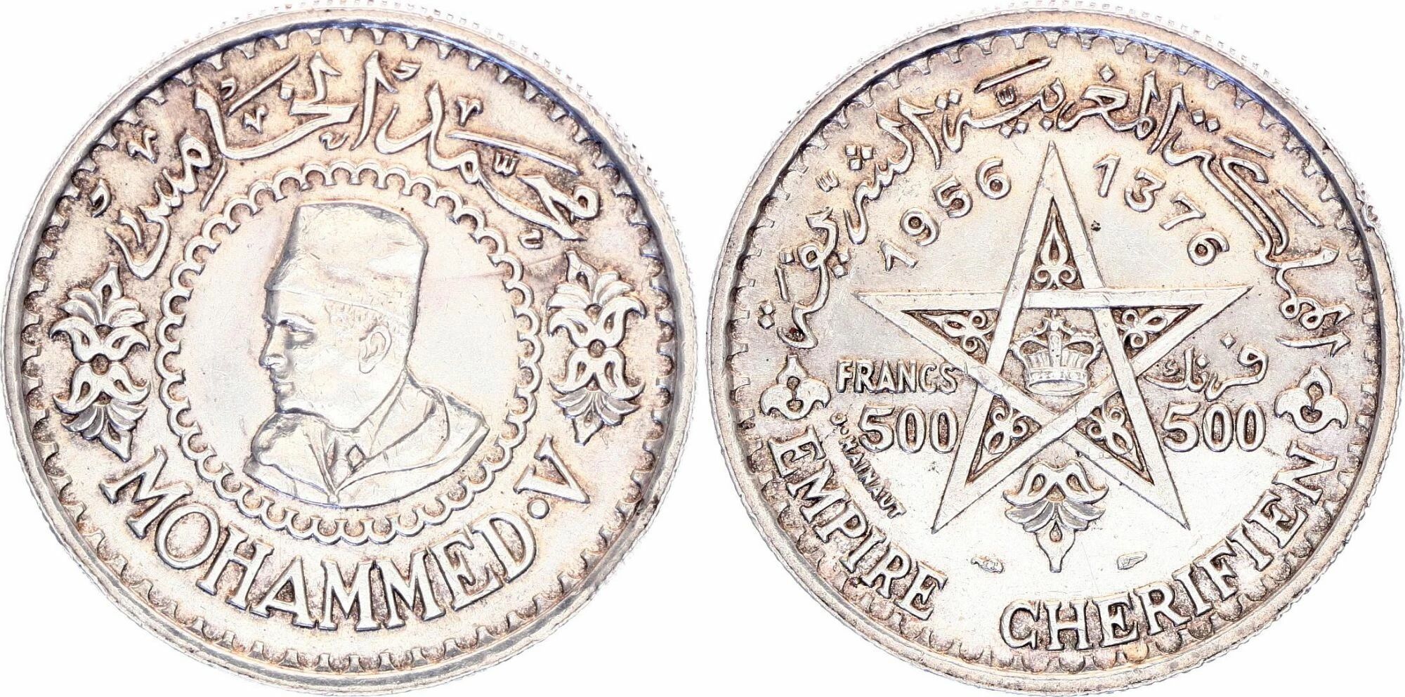 Coin Morocco 500 Francs Mohammed V - 1376(1956) - Silver - Paris