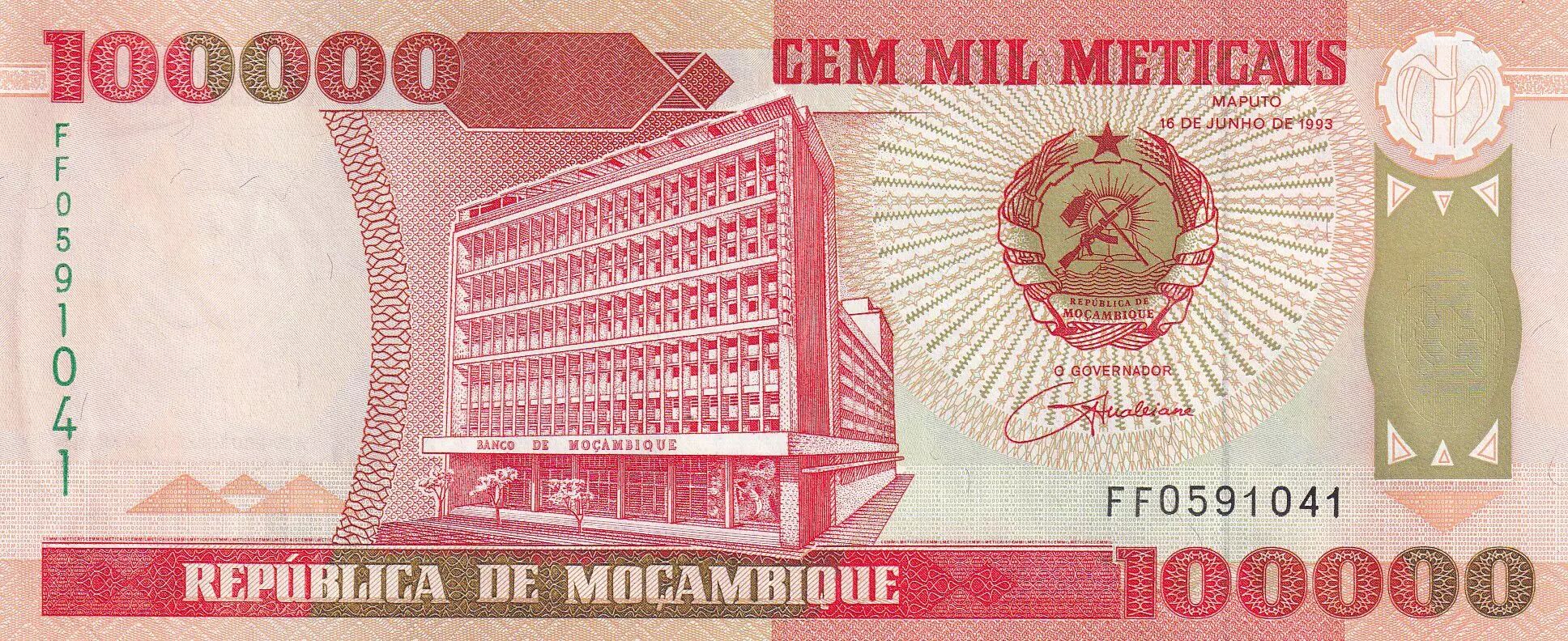 Home > World Banknotes > African Banknotes > Mozambique > Mozambique 100000 Meticais - Bank of Mozambique - Hydroelectric dam - 1993 - Serial FF - P.139