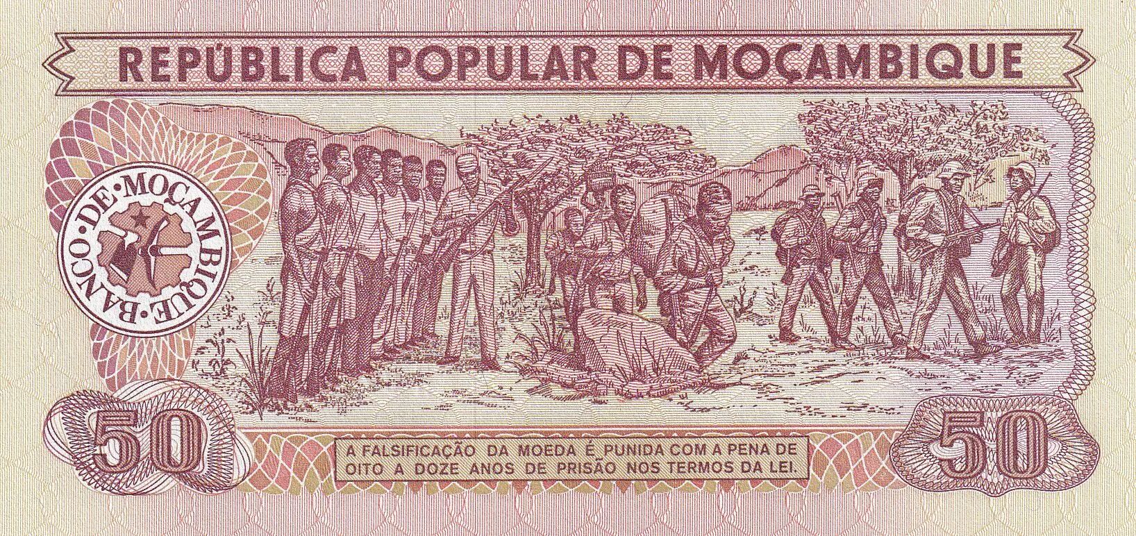 Banknote Mozambique 50 Meticais - Soldiers, flag ceremony - 1986 - Serial AK - P.129b