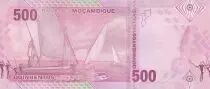 Le verso du billet met en scène une magnifique illustration de voiliers naviguant sur les eaux du Mozambique. Ces voiliers rappellent l?histoire maritime riche du pays et son lien profond avec l'océan Indien. La scène évoque non seulement les échanges commerciaux et culturels historiques de la région, mais également l?esprit d?aventure et d'exploration maritime. Le fond du billet présente des éléments de la faune et de la flore marines locales, créant une ambiance qui capture la beauté des côtes mozambicaines.