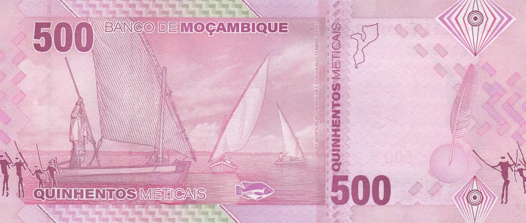 The reverse side of the note depicts a beautiful scene of sailing ships navigating the waters of Mozambique. These ships serve as a reminder of the country?s rich maritime history and its deep connection to the Indian Ocean. The scene not only evokes the historical cultural and commercial exchanges in the region but also the spirit of maritime exploration and adventure. The background showcases elements of the local marine flora and fauna, capturing the scenic beauty of Mozambique?s coastlines.