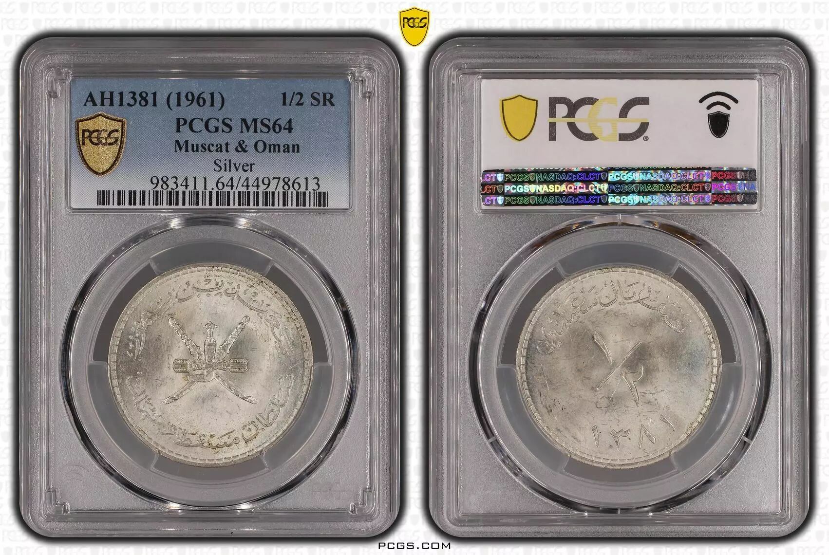 Home > World Coins > Asian Coins > Muscat and Oman > Muscat and Oman 1/2 Saidi Rial , Arms - Silver 1961 - PCGS MS64