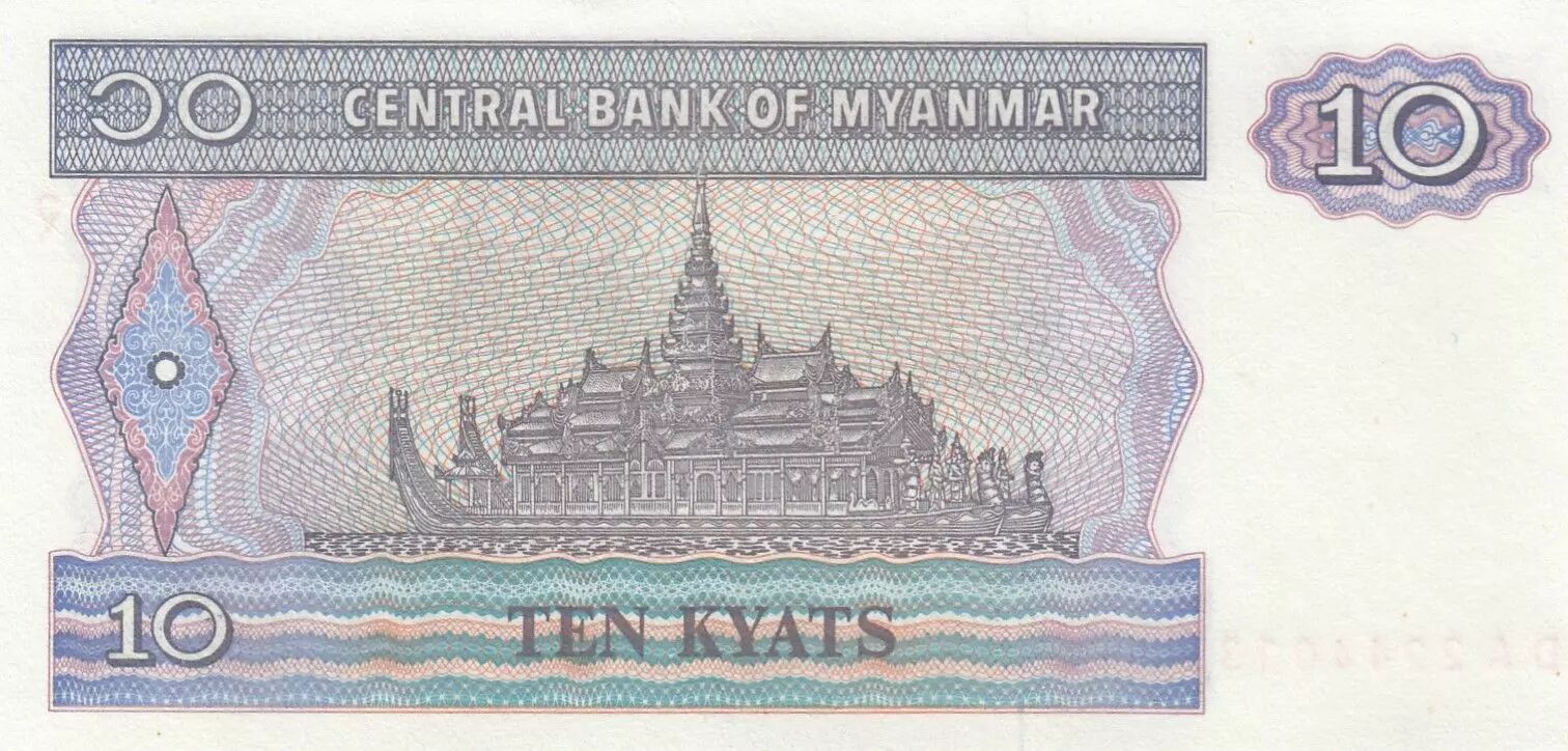 The back of the banknote illustrates a Karaweik, an ornate and mythical royal barge, often used in ceremonies and festivals. The inscriptions in English indicate « CENTRAL BANK OF MYANMAR » at the top, as well as the face value « TEN KYATS » at the bottom, with the numeric value « 10 » placed on either side of the Karaweik representation.