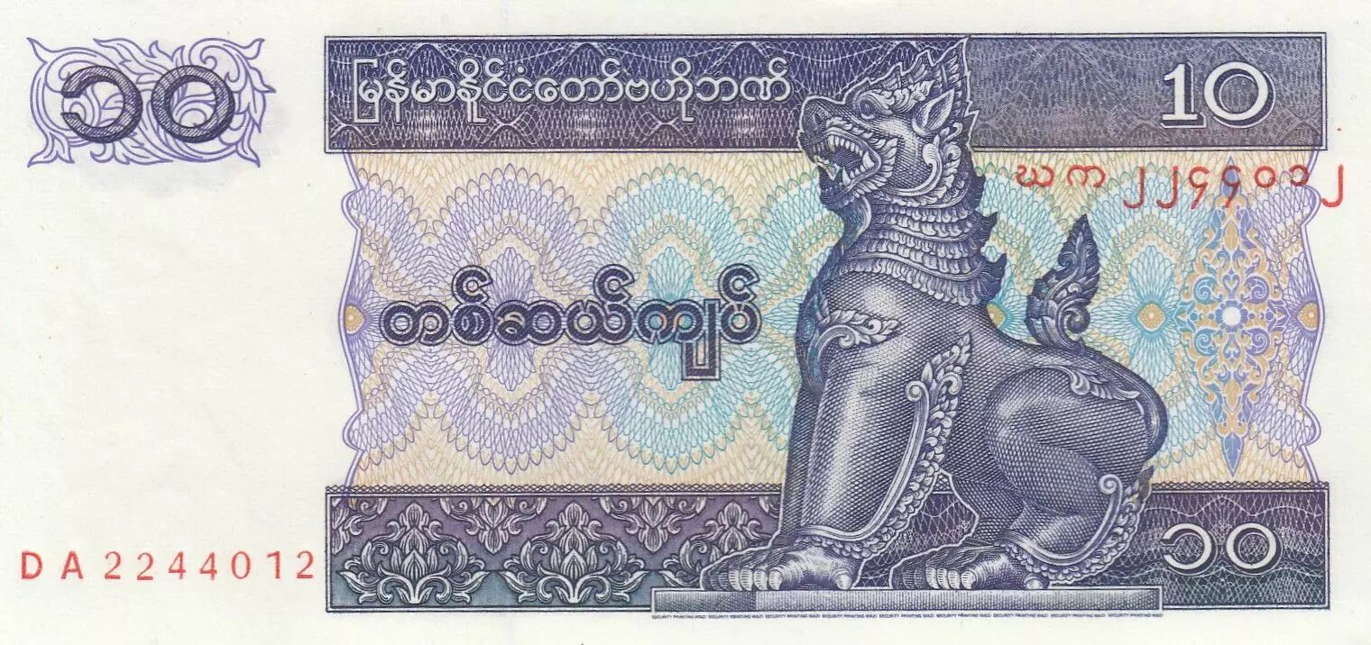 Le billet de 10 kyats du Myanmar, émis en 1997, se distingue par sa couleur dominante violette. Il mesure 130 mm de longueur et 60 mm de largeur. Le recto du billet présente un Chinthe, créature mythique birmane, symbole protecteur souvent représenté comme un lion. On y trouve également des inscriptions en birman, notamment le nom de la Banque Centrale du Myanmar (????????????????????????) et la valeur nominale du billet, « ??????? », signifiant « dix kyats ». La valeur numérique « 10 » est imprimée en chiffres arabes à deux endroits.