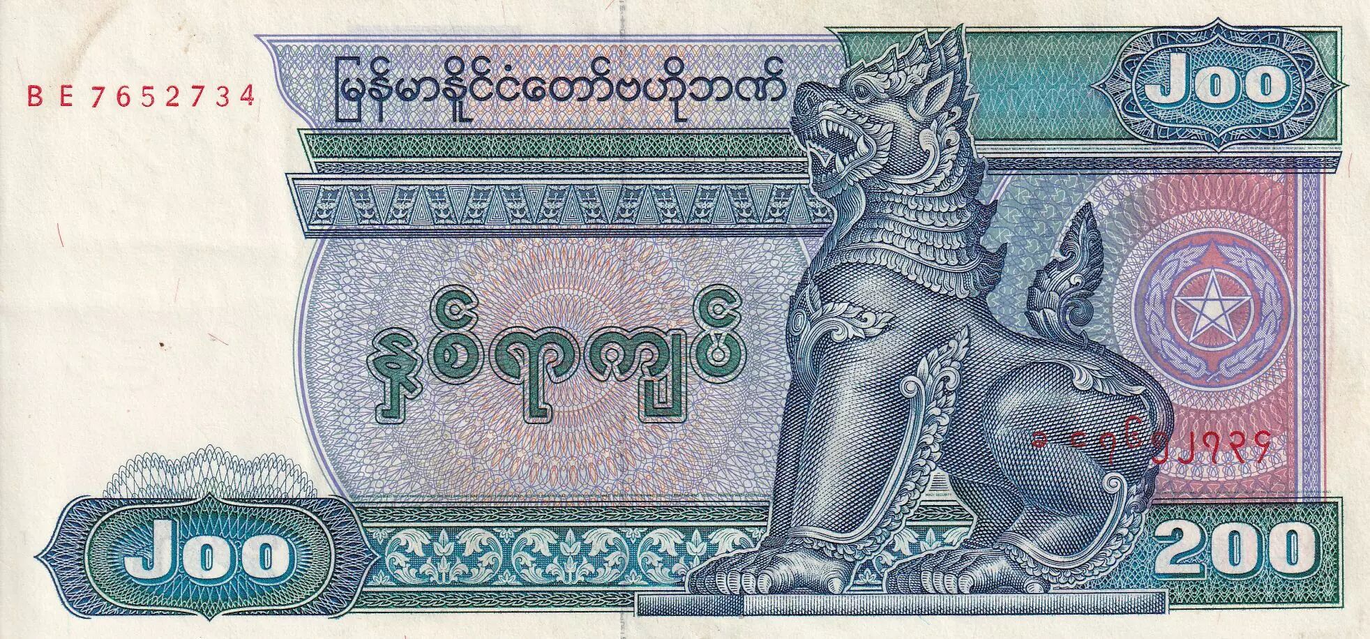 Accueil > Billets du Monde > Billets d'Asie > Myanmar > Myanmar 200 Kyats- Shinzé - Eléphant - 1994 - P.NEUF - P.75