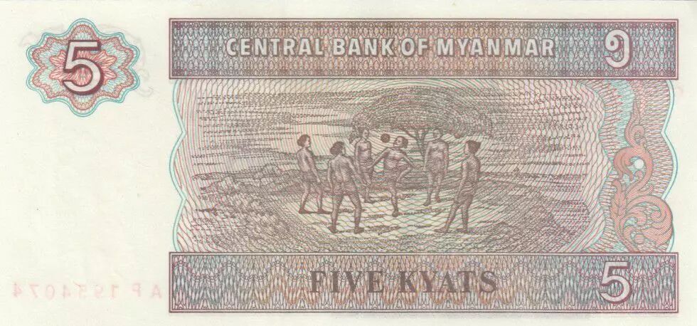 Home > World Banknotes > Asian Banknotes > Myanmar > Myanmar 5 Kyat Chinze - Game ball scene - Serial AP - 1996