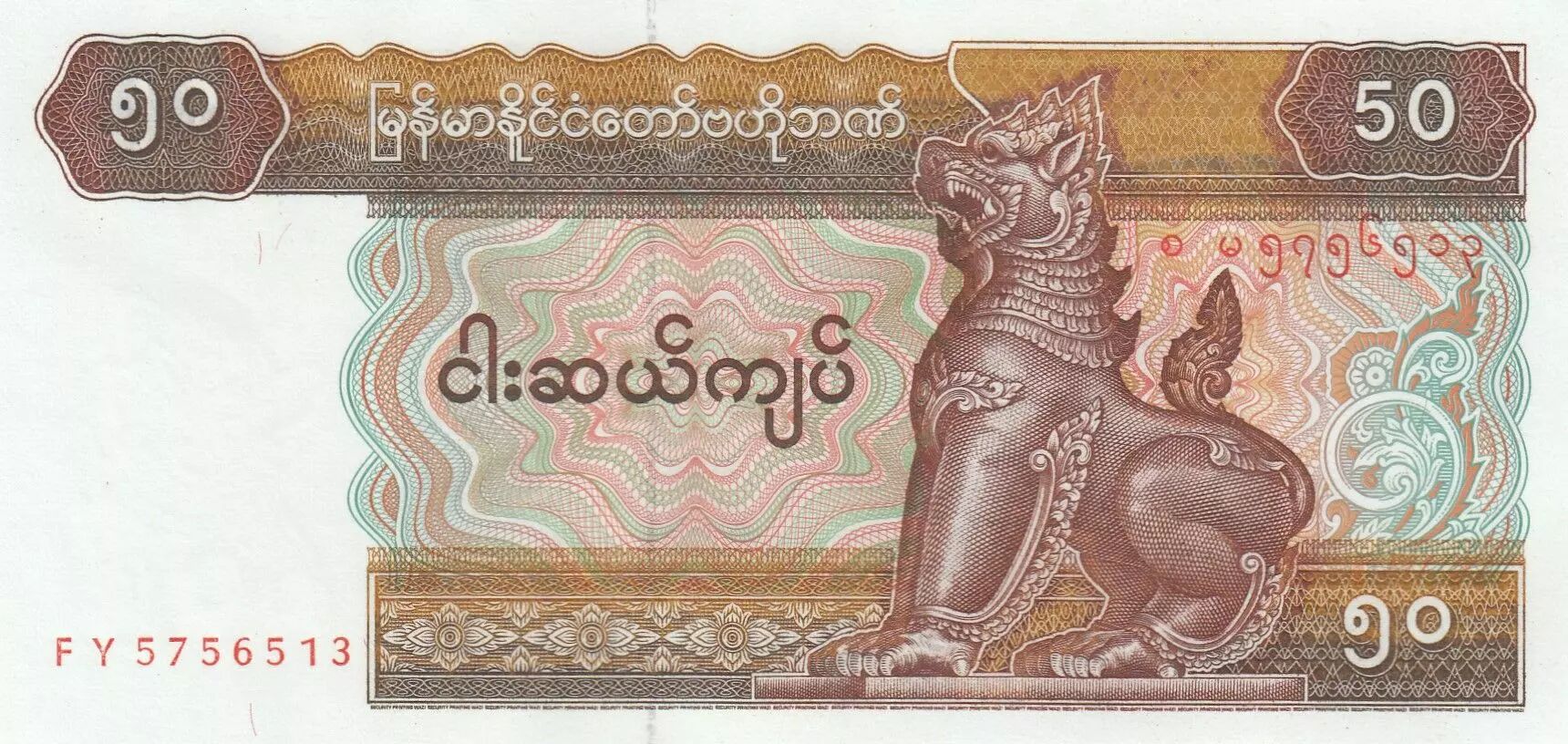 Le billet de 50 kyats, émis par la Banque Centrale du Myanmar, date de la série FY de la période 1977-1997, avec l'année d'émission spécifiée à 1997. Ses dimensions sont de 145 mm de longueur et 70 mm de largeur.
