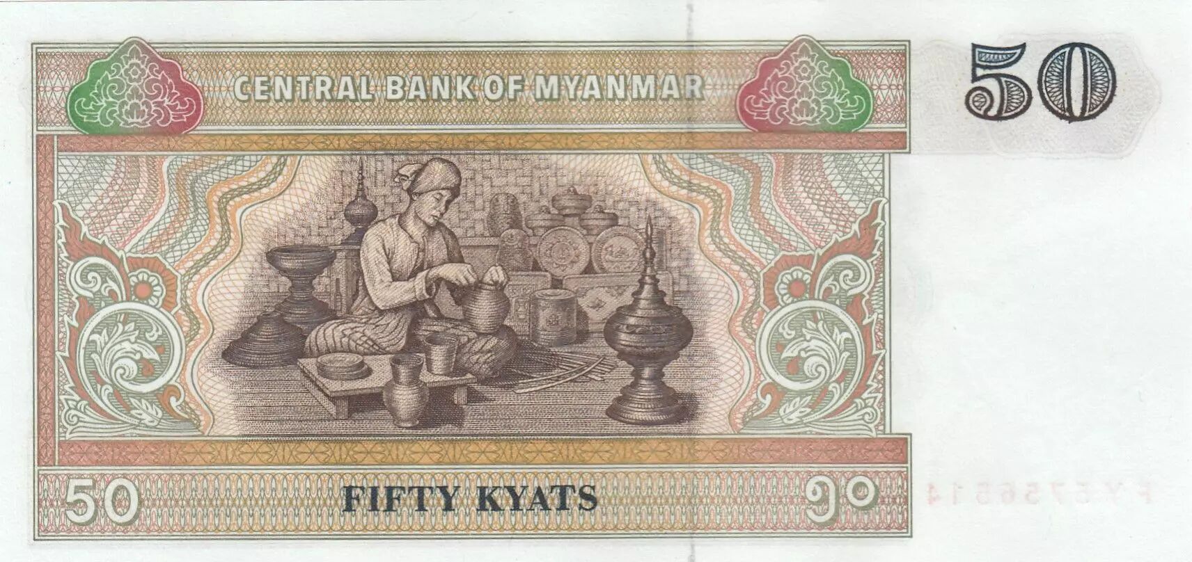 Au verso, le billet représente un artisan travaillant la laque, une forme d'artisanat traditionnelle du Myanmar. Les inscriptions en anglais comprennent "CENTRAL BANK OF MYANMAR" ainsi que la valeur nominale "50" et "FIFTY KYATS".