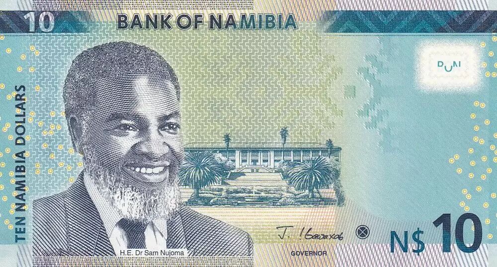This banknote is issued by the Bank of Namibia and has a face value of 10 Namibian dollars. It dates from the year 2021. The front of the banknote features a portrait of Dr. Sam Nujoma, a political figure associated with this banknote, as well as a representation of the Parliament building located in Windhoek.