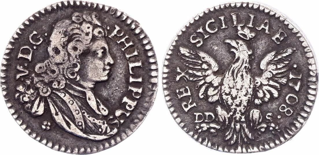 Cette pièce de monnaie est un tari frappé à Palerme en 1708, sous le règne de Philippe V, pour le royaume de Naples. Sa valeur nominale est de 1 tari.