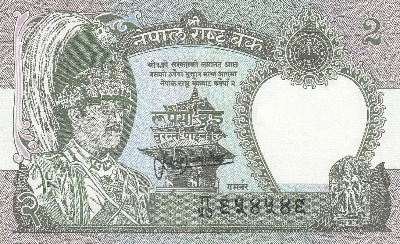 The obverse of the banknote is dominated by a green print. There is a portrait of King Birendra Bir Bikram Shah Dev, recognizable by his feather-adorned crown, positioned on the left. In the center, a representation of the Bajrayogini Temple is visible, while a watermark window is located on the right. The inscriptions are written in Devanagari script and the number "2" is present.