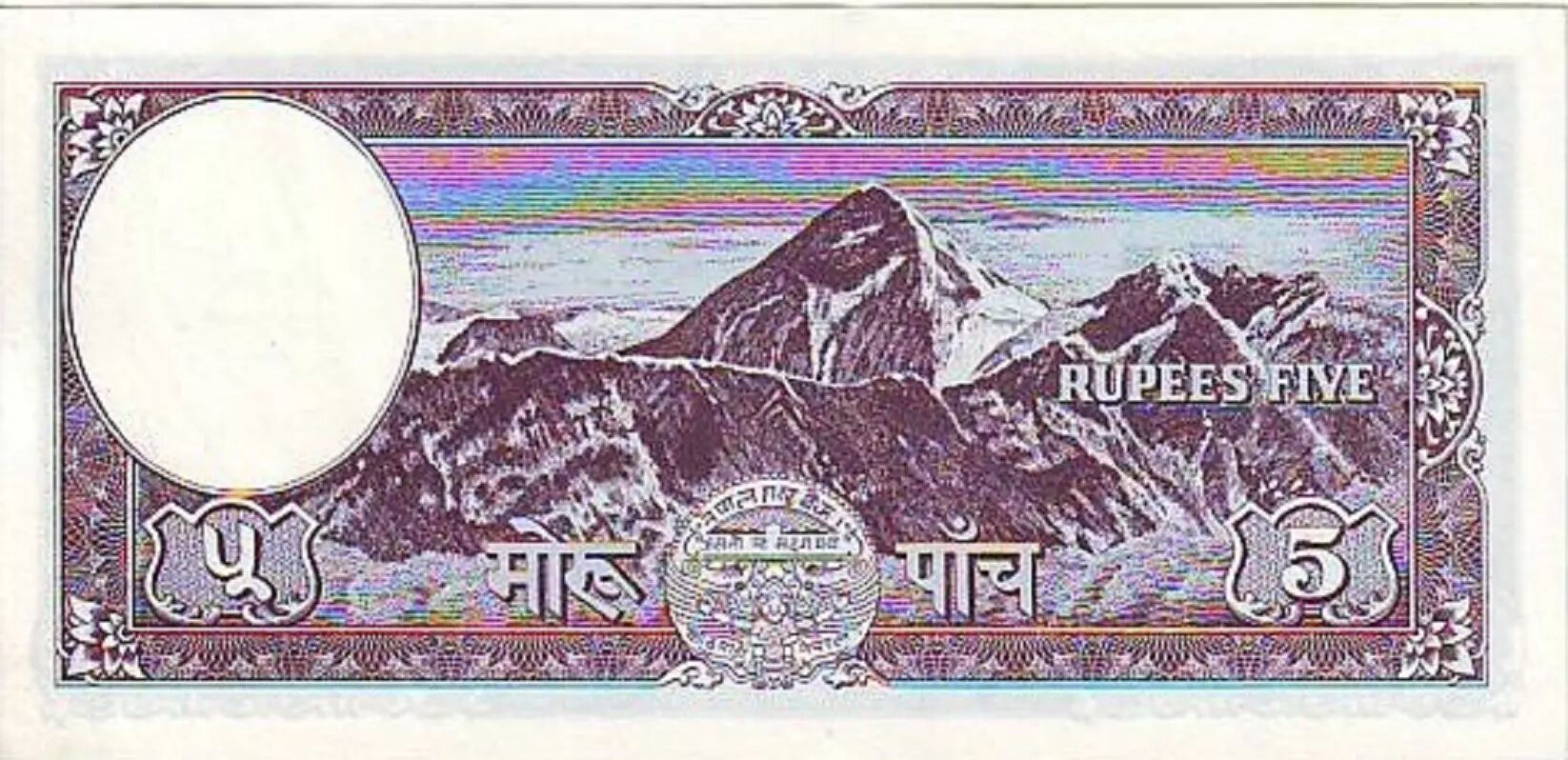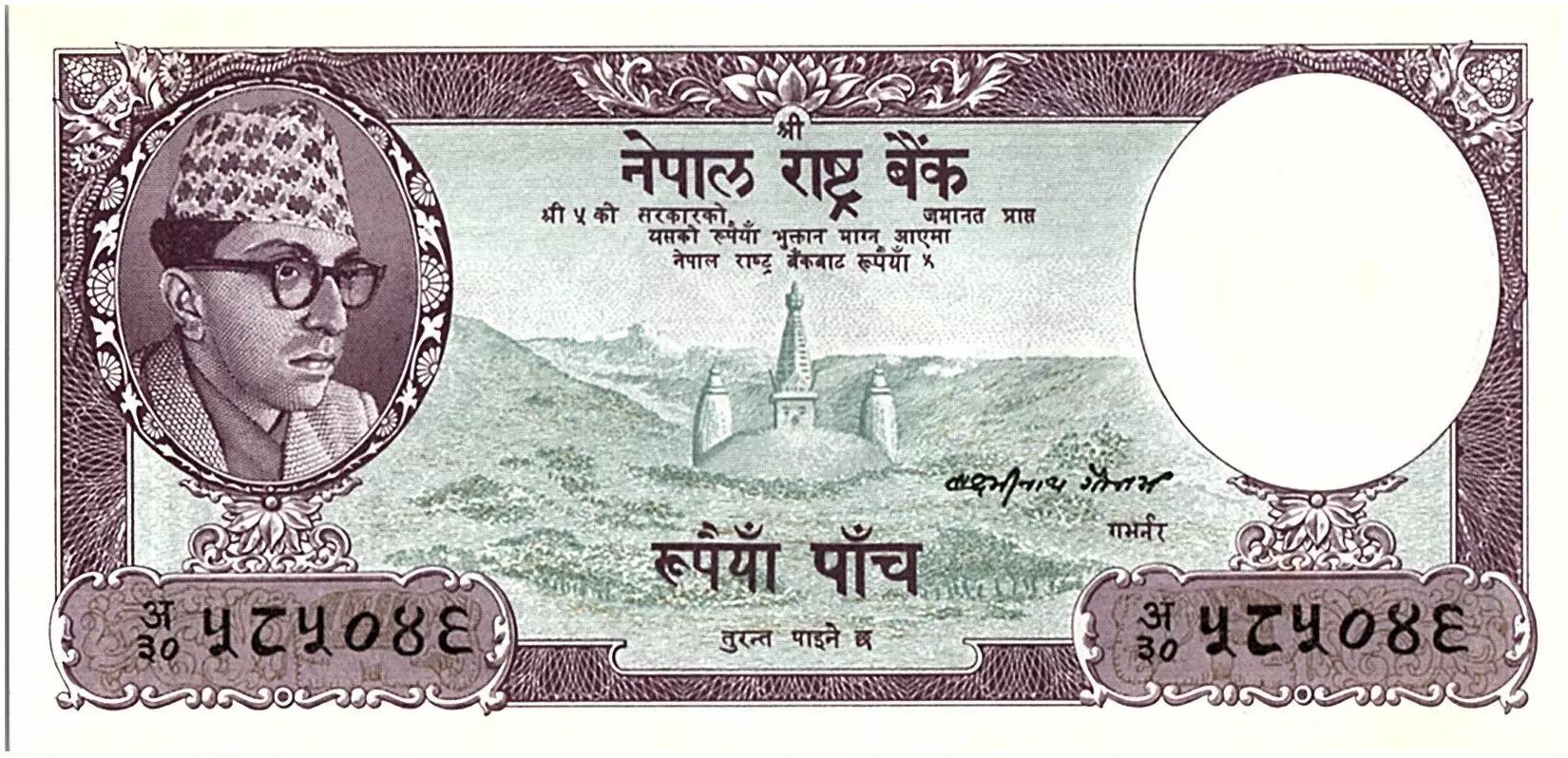Billet Népal 5 Mohru, Roi Mahandra Vira Vikrama - Montagnes - 1960 - P.9