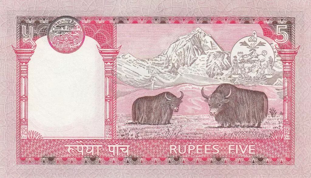 Banknote Nepal 5 Rupees, Kg Birendra Bir Bikram, temple - Yaks - 2002 - P.46