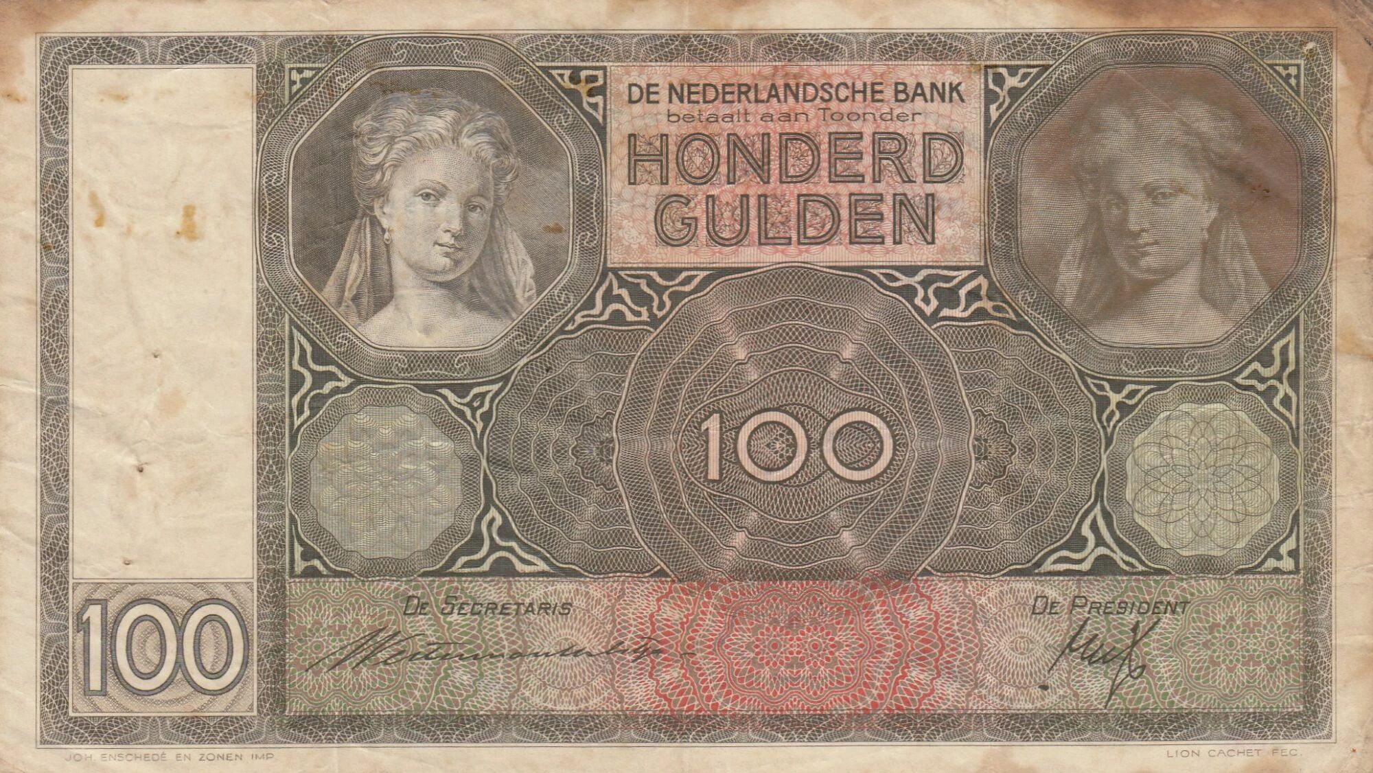 This banknote from the Netherlands has a face value of 100 guilders, issued in 1937.