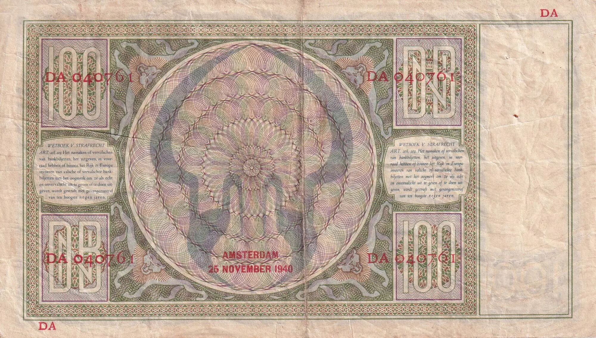 Banknote Netherlands 100 Gulden - Women portrait - 26-11-1940 - Serial DA - P.51a