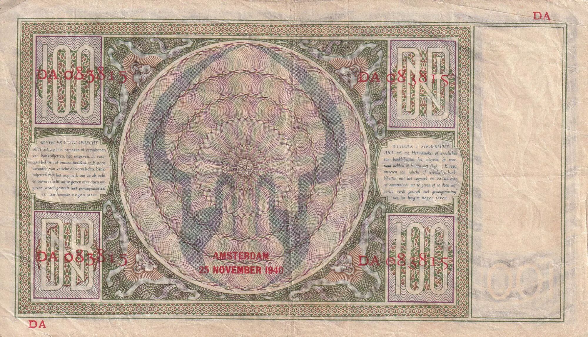Banknote Netherlands 100 Gulden - Women portrait - 26-11-1940 - Serial DA - P.51a