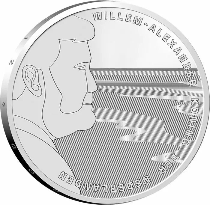 The 5 euro coin "200 years of the Royal Netherlands Sea Rescue Institution" (KNRM) was designed by Coralie Vogelaar, in collaboration with designer Hendrik-Jan Grievink. The obverse of the coin depicts the King of the Netherlands Willem-Alexander. He is seen looking at the peaceful coast of the North Sea, his gaze fixed on the horizon. In the upper part, the text "Willem-Alexander, Koning der Nederlanden" begins and continues in a semicircle. On the reverse of the coin, the sea shows itself in a very different light: the turbulent and wild waves carry the silhouette of a KNRM rescue boat with two volunteers on board. When the coin moves, the light changes, which further accentuates the dynamics of the sea. The text "Koninklijke Nederlandse Redding Maatschappij 1824 - 2024" is also on the reverse, as are the private mark and the mint mark.