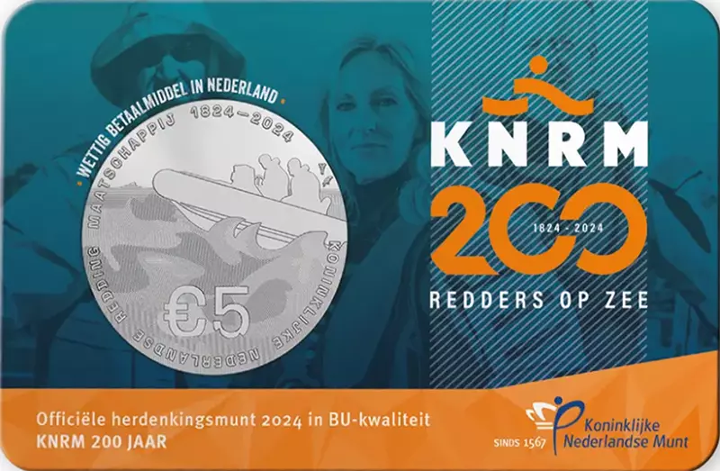 The 5 euro coin "200 years of the Royal Netherlands Sea Rescue Institution" (KNRM) was designed by Coralie Vogelaar, in collaboration with designer Hendrik-Jan Grievink. The obverse of the coin depicts the King of the Netherlands Willem-Alexander. He is seen looking at the peaceful coast of the North Sea, his gaze fixed on the horizon. In the upper part, the text "Willem-Alexander, Koning der Nederlanden" begins and continues in a semicircle. On the reverse of the coin, the sea shows itself in a very different light: the turbulent and wild waves carry the silhouette of a KNRM rescue boat with two volunteers on board. When the coin moves, the light changes, which further accentuates the dynamics of the sea. The text "Koninklijke Nederlandse Redding Maatschappij 1824 - 2024" also appears on the reverse, as well as the private mark and the mint mark.