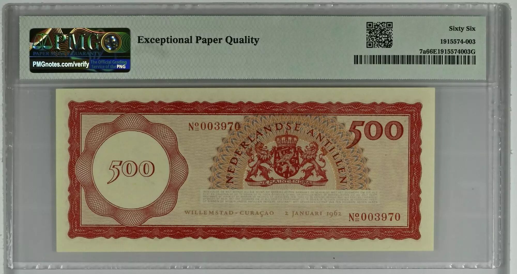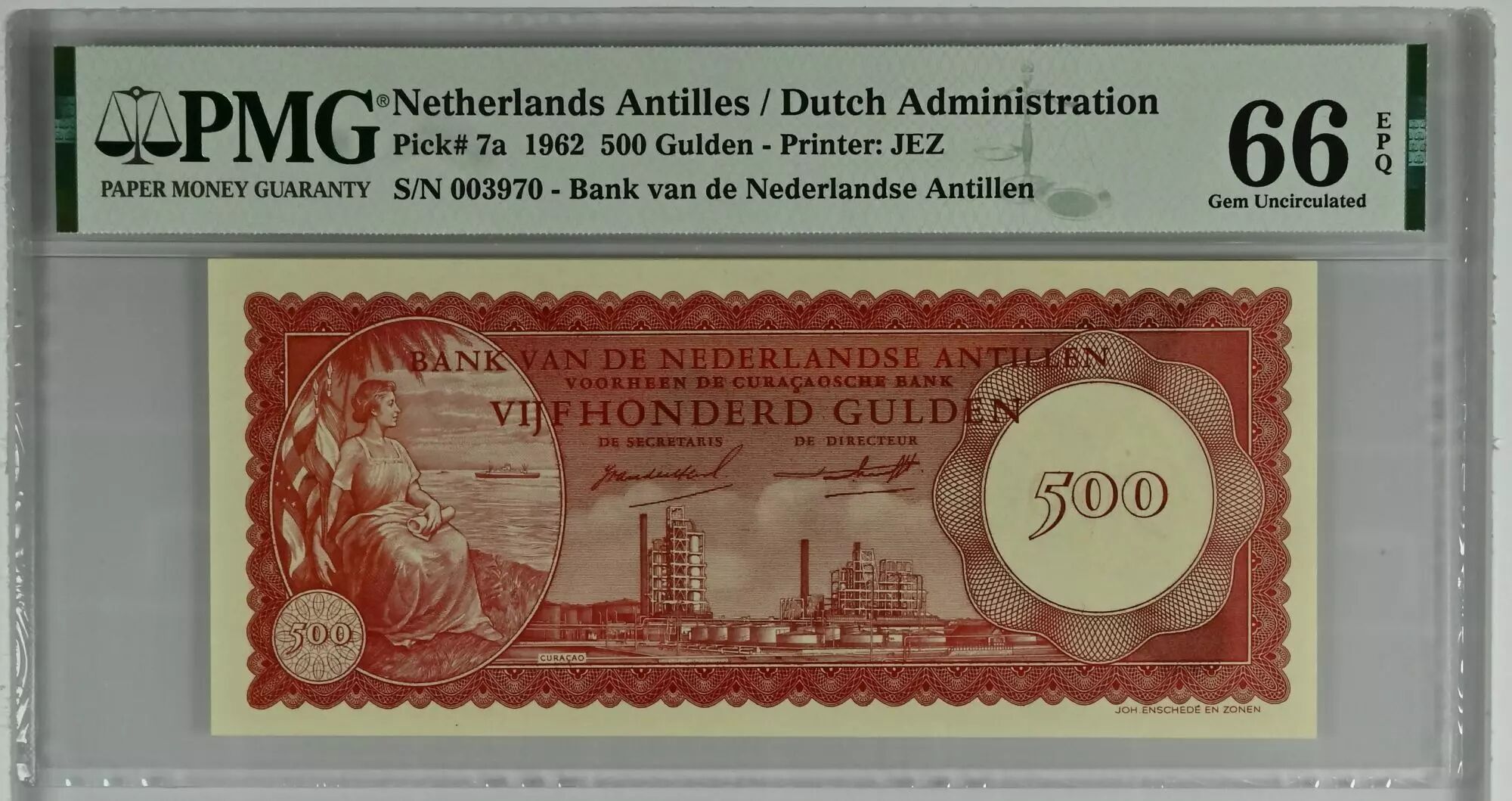 Home > > Netherlands Antilles 500 Gulden 1962 - Oil refinery of Curacao - PMG 66 EPQ