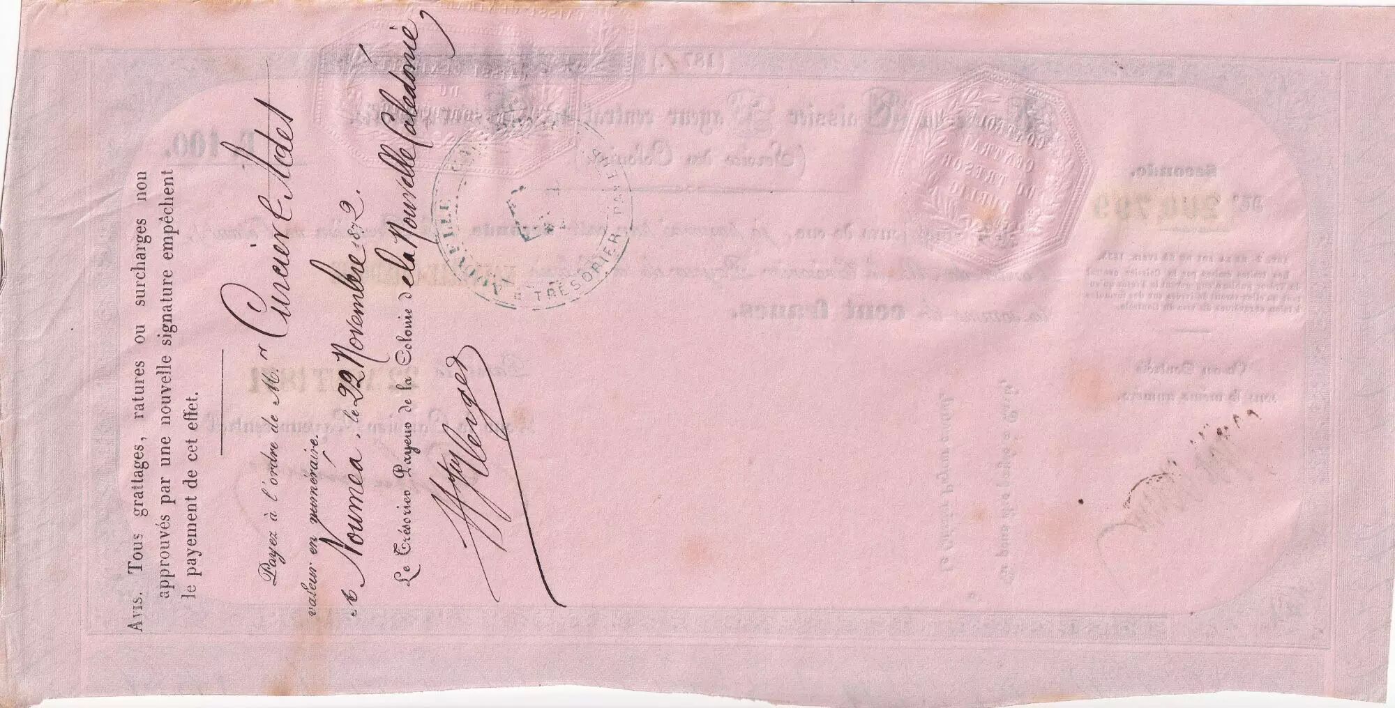 Banknote New Caledonia 100 Francs - French colonial note - 22-08-1871 - XF+