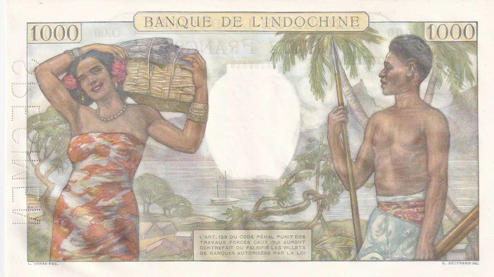 The back of the banknote, also multicolored, features an indigenous woman on the left and an indigenous hunter on the right. It includes the inscriptions "BANQUE DE L'INDOCHINE" and "1000", as well as a legal warning: "ARTICLE 139 OF THE PENAL CODE PUNISHES WITH FORCED LABOR THOSE WHO HAVE COUNTERFEITED OR FALSIFIED BANK NOTES AUTHORIZED BY LAW". The names of the engravers and designers, L. JONAS FEC. and G. BELTRAND SC., are reversed compared to the front, indicating that Georges Léon Égalité Beltrand is the designer and Lucien Hector Jonas the engraver.