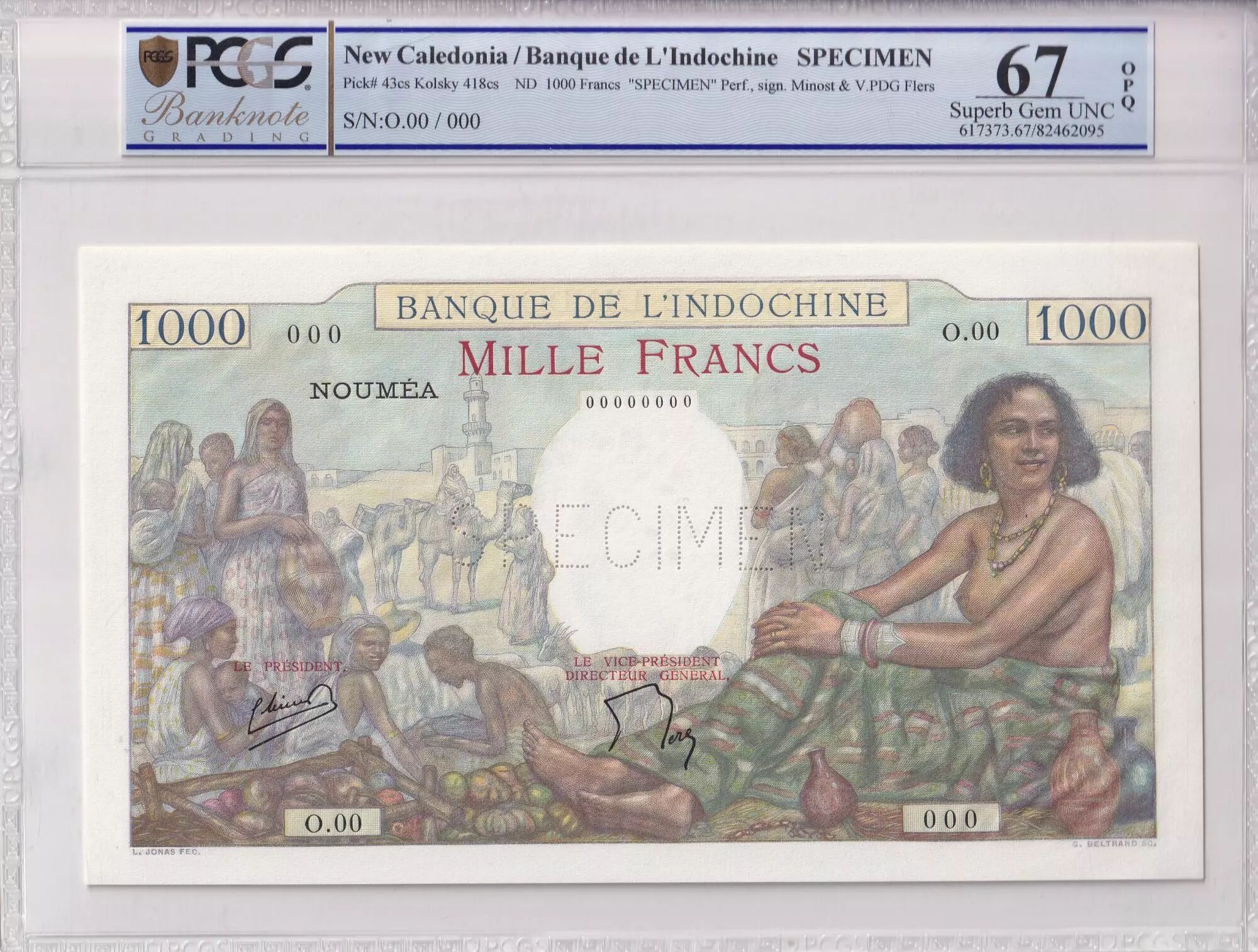 Home > > New Caledonia 1000 Francs - Woman seated - Specimen 1937 (1953) - Serial O.00/000 - PCGS 67 OPQ