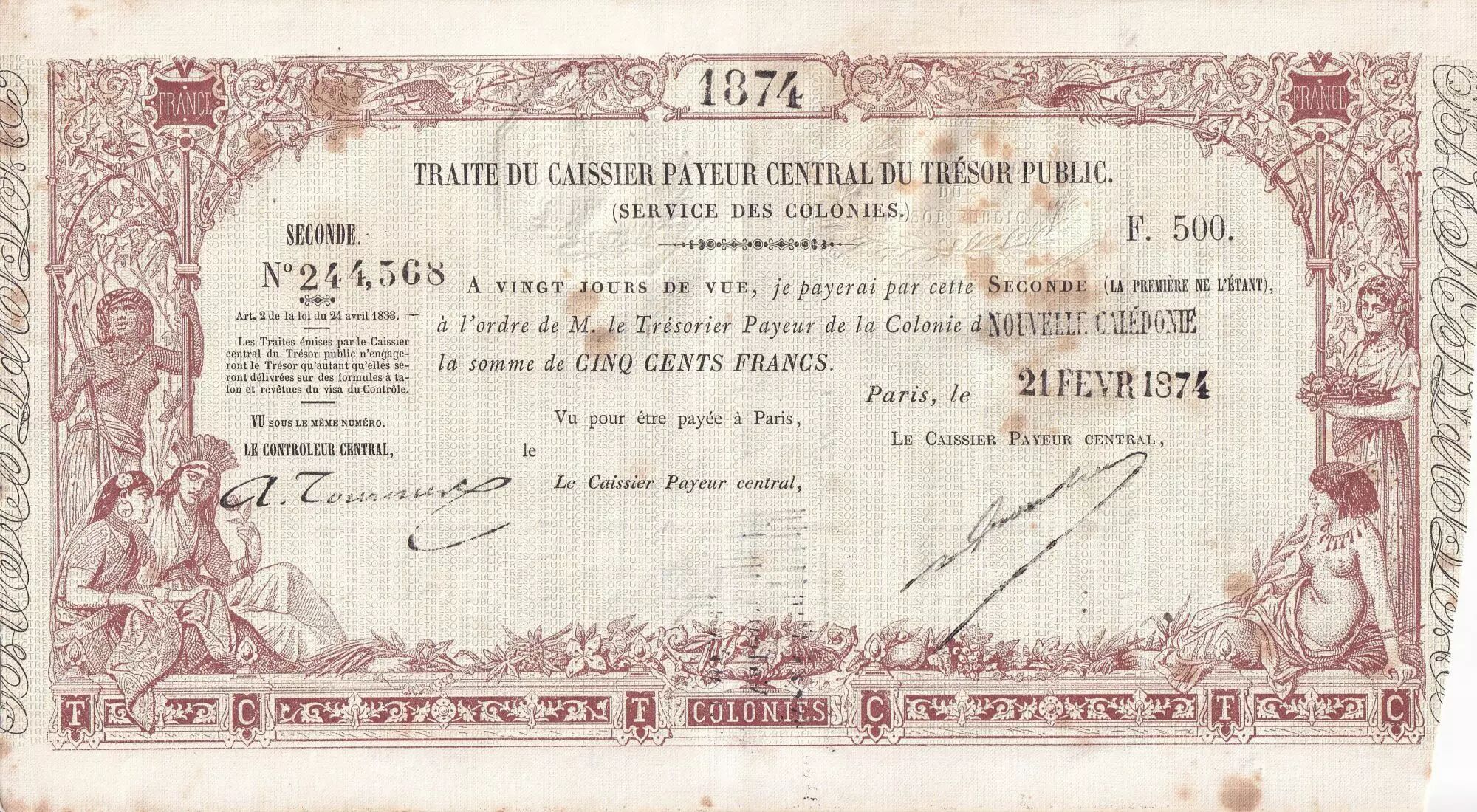 Banknote New Caledonia 500 Francs - French colonial note - 21-02-1874 - XF+