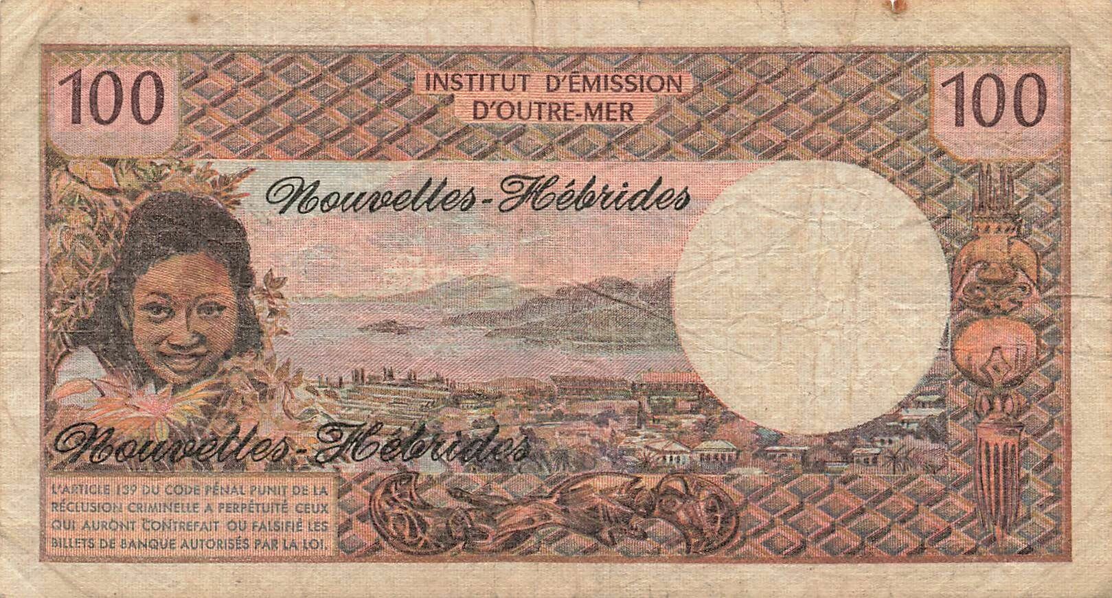 Home > World Banknotes > Oceania Banknotes > New Hebrides > New Hebrides 100 Francs - ND (1975) - P.18c