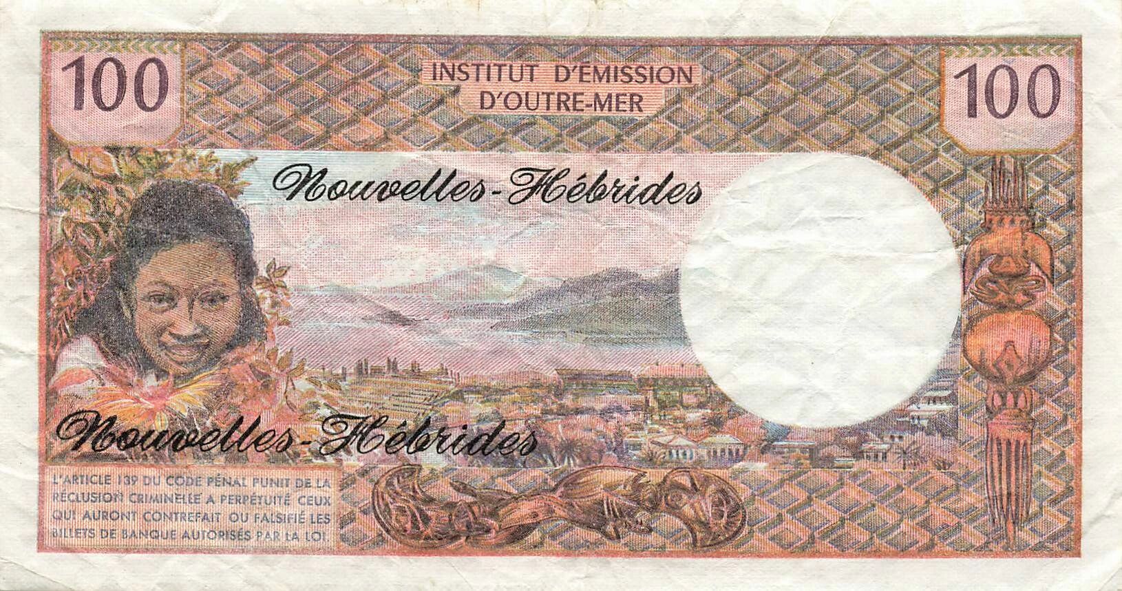 Home > World Banknotes > Oceania Banknotes > New Hebrides > New Hebrides 100 Francs - ND (1977) - P.18d