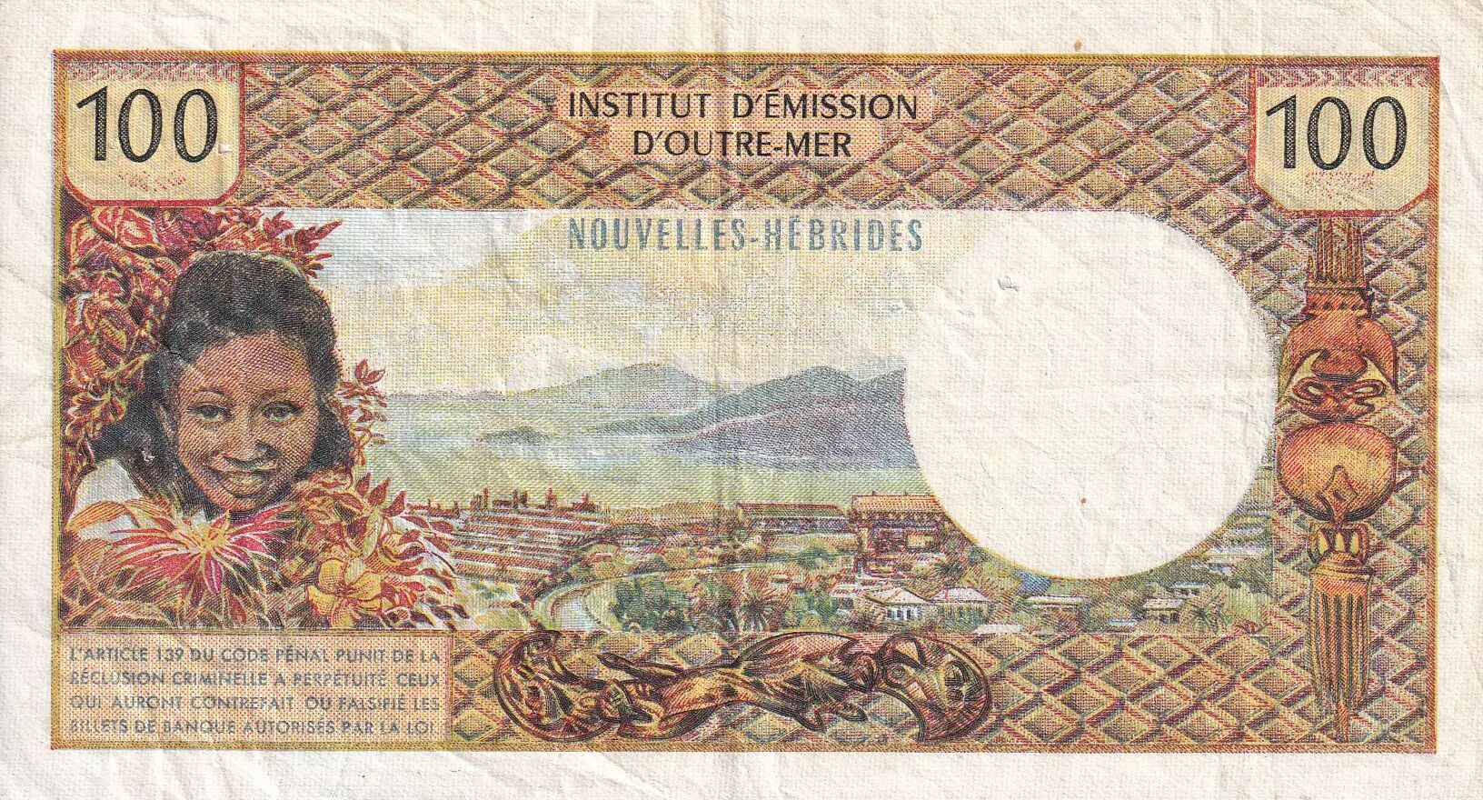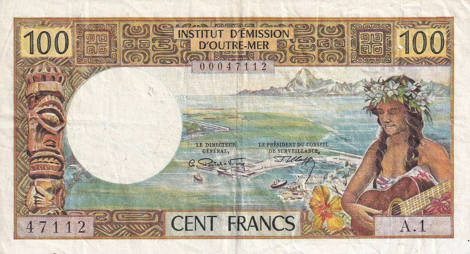 Home > > New Hebrides 100 Francs Tahitienne - 1972 - Serial A.1 - VF - P.18b