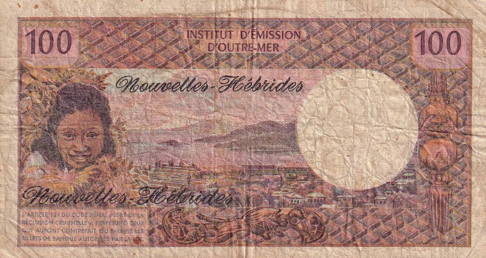 Home > > New Hebrides 100 Francs - Tahitienne - 1975 - Serial U.1 - VG to F - P.18c