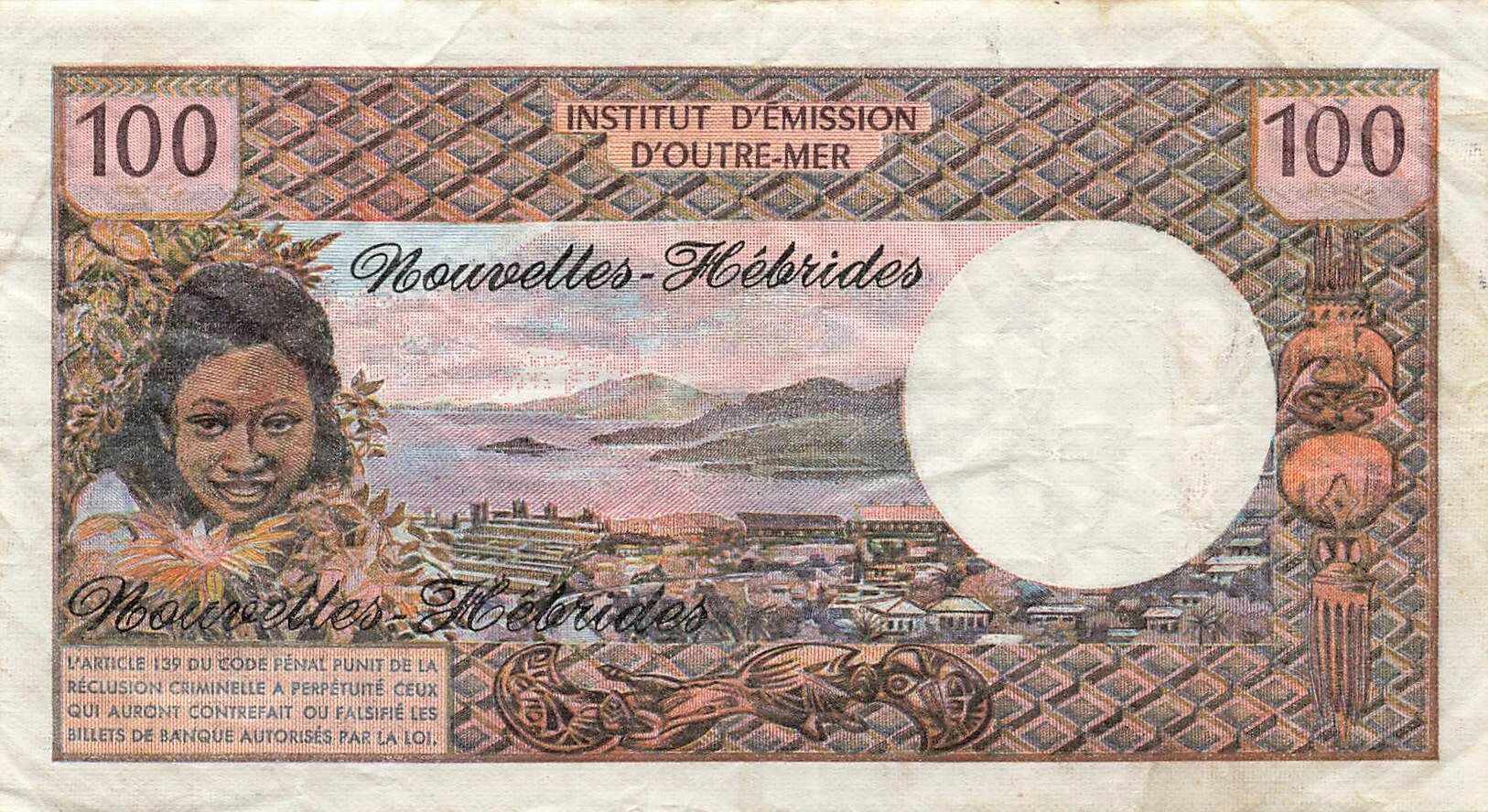 Home > World Banknotes > Oceania Banknotes > New Hebrides > New Hebrides 100 Francs - Tahitienne - ND (1975) - P.18c