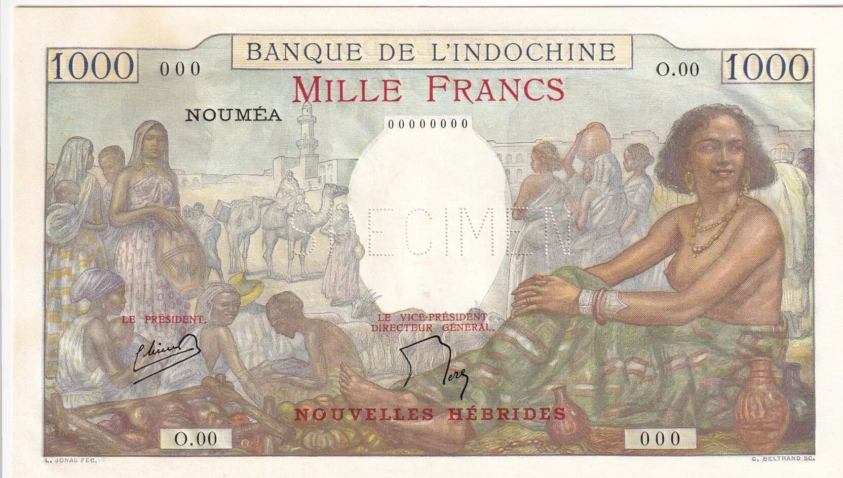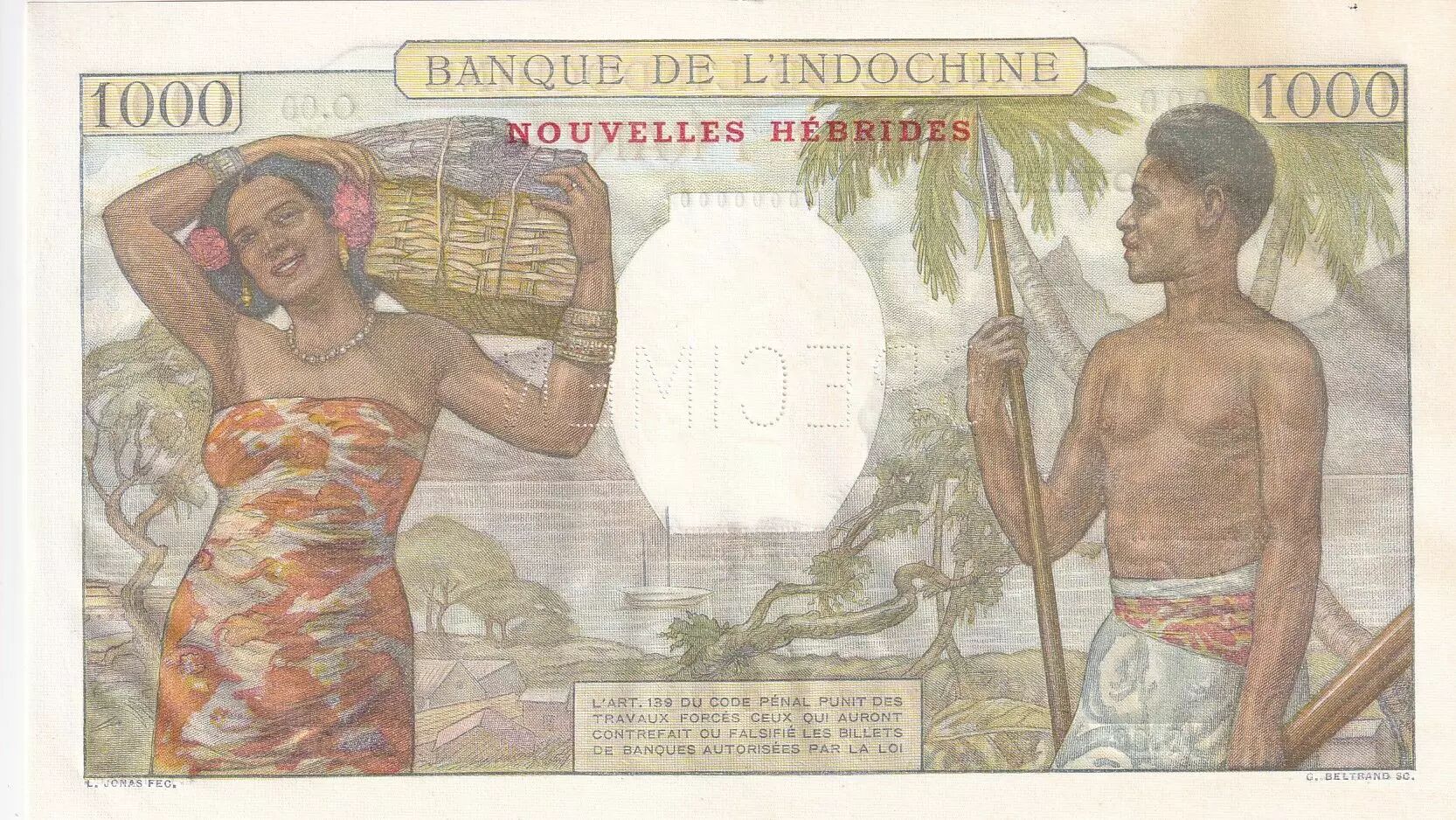 This banknote is a 1000 francs specimen issued in 1945 for the New Hebrides. It has distinct visual characteristics on both sides.