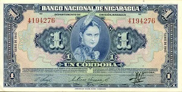 Home > World Banknotes > American Banknotes > Nicaragua > Nicaragua 1 Cordoba Indian woman - 1945 - AU - P.90