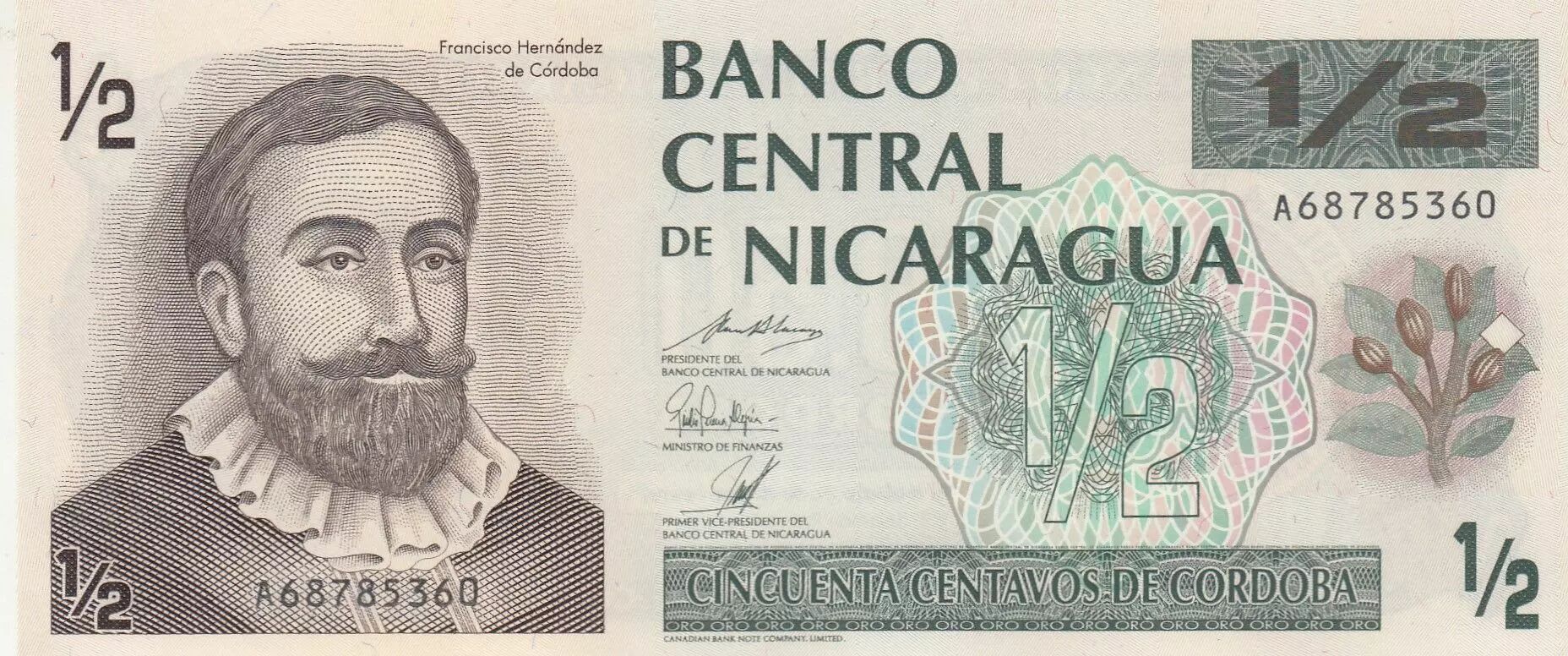 Ce billet de banque, d'une valeur de 1/2 cordoba, a été émis en 1992 par le Banco Central de Nicaragua. Il appartient à la Série A et rend hommage à Francisco Hernandez de Cordoba. Le billet mesure 156 mm de longueur et 67 mm de largeur.